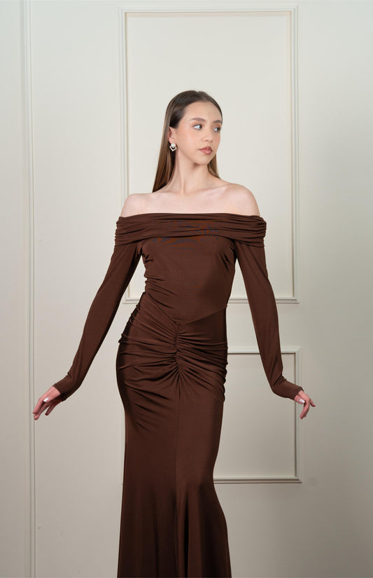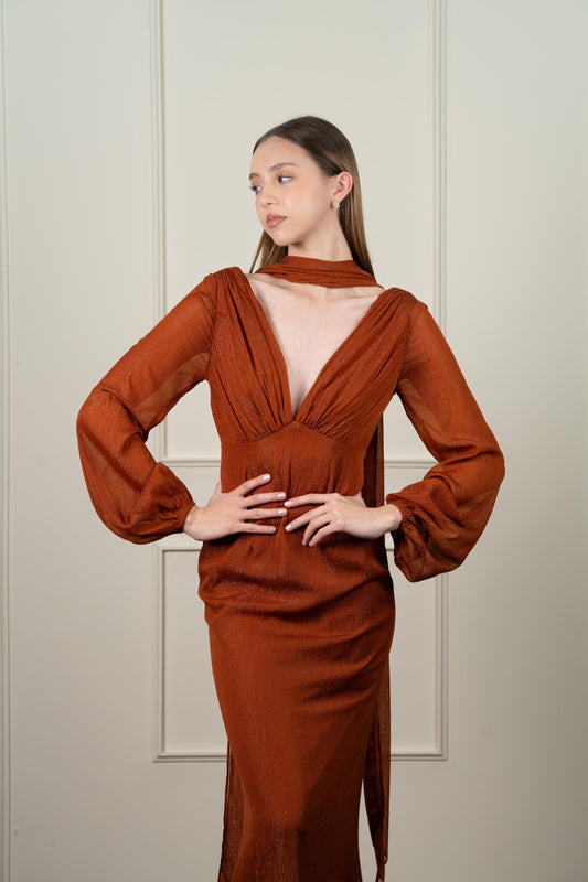 Vestido Con Brillos Manga Larga Corrugado En Cintura
