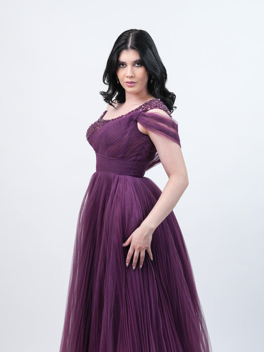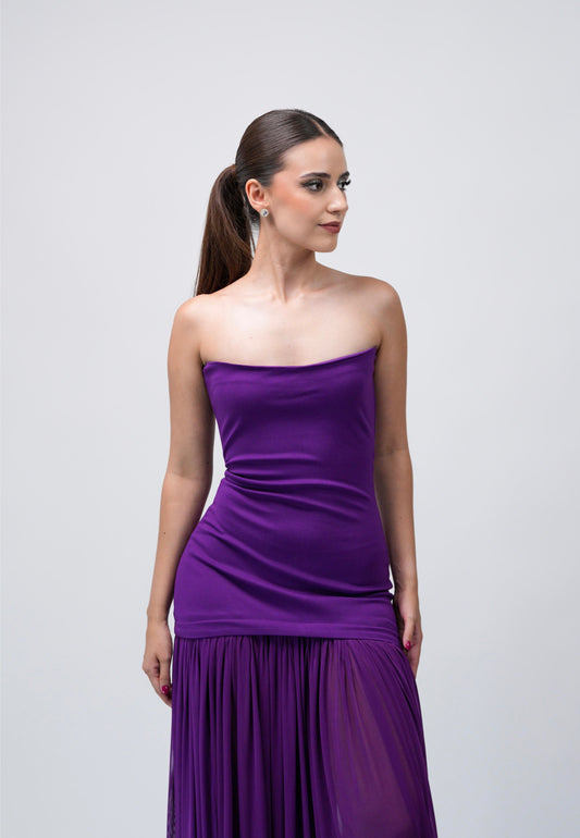 Vestido Morado Strapless Manga Caída con Detalles