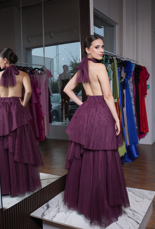 Vestido Morado de Tul Cuello Halter Espalda Descubierta