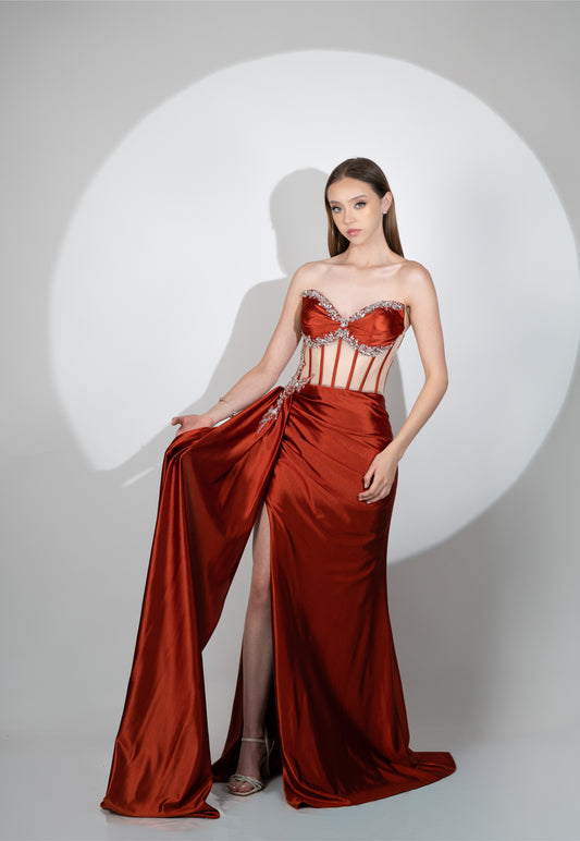Vestido Terracota con Piedras una manga y estola con Velo