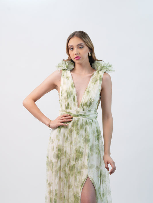 Vestido Verde Con Blanco Flor En Hombros