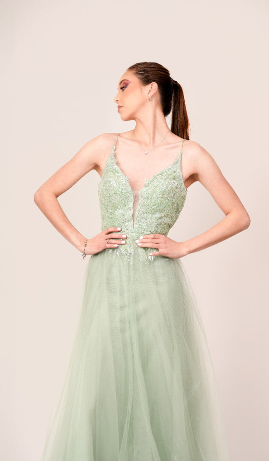 Vestido Verde Sage Straple Corset Con Olan