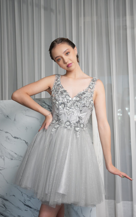 Vestido XV Años Gris Lentejuela Tirante Grueso Corto