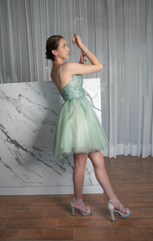 Vestido XV Años Verde Sage Gliter Flores Corto