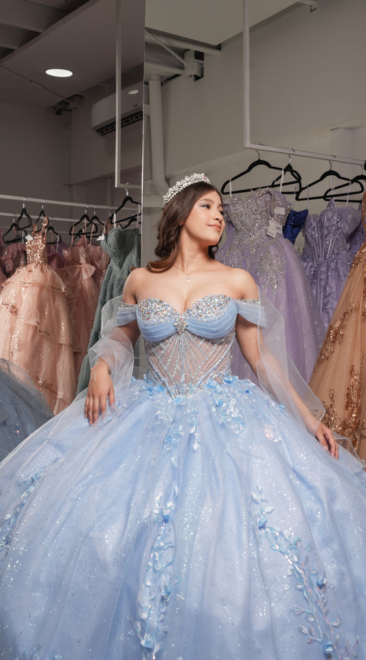 Vestido XV Años Azul Cielo Encaje Flores Manga Campesinas Piedras Pecho