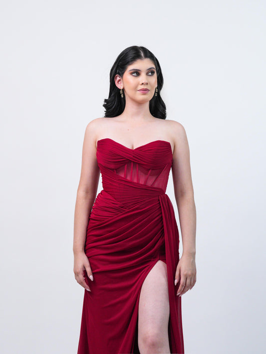 Vestido Vino Straple Corrugado En Abdomen Y Banda