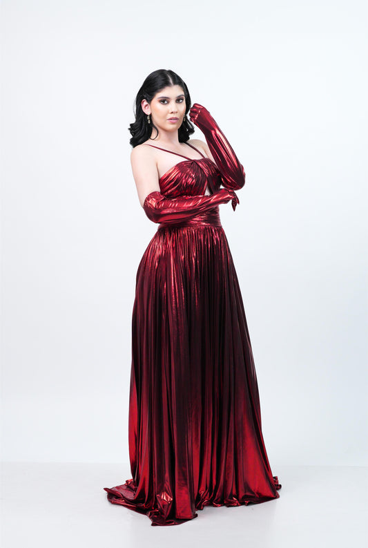 Vestido Vino Metalico Y Guantes