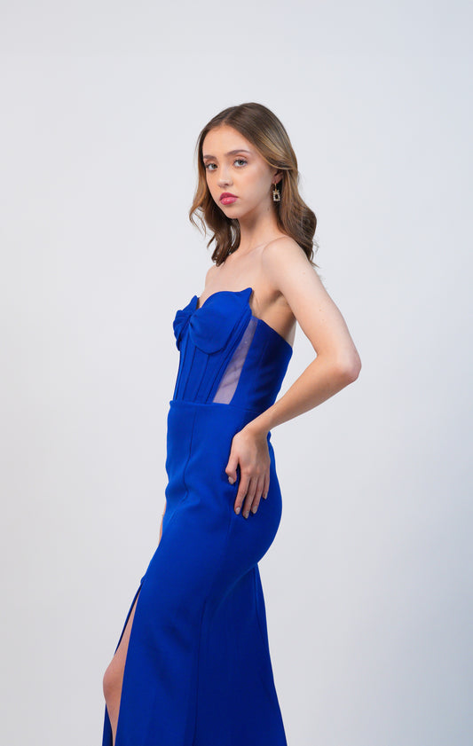 Vestido Azul Royal Straple Grapeado Moño en Escote