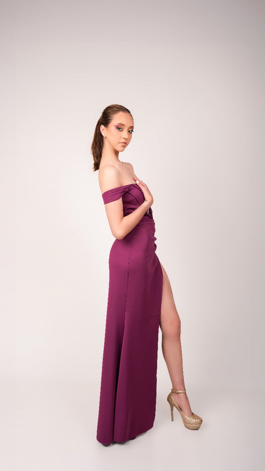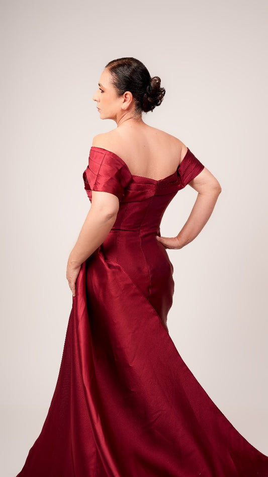 Vestido Borgoña Manga Caida Detalle En Pliegue Con Estola