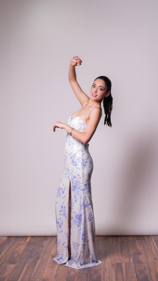 Vestido Blanco con estampado azul de corset
