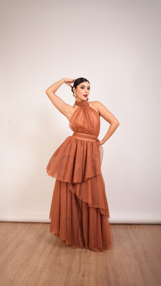 Vestido Cobre Manga Caída Y Tirantes Banda