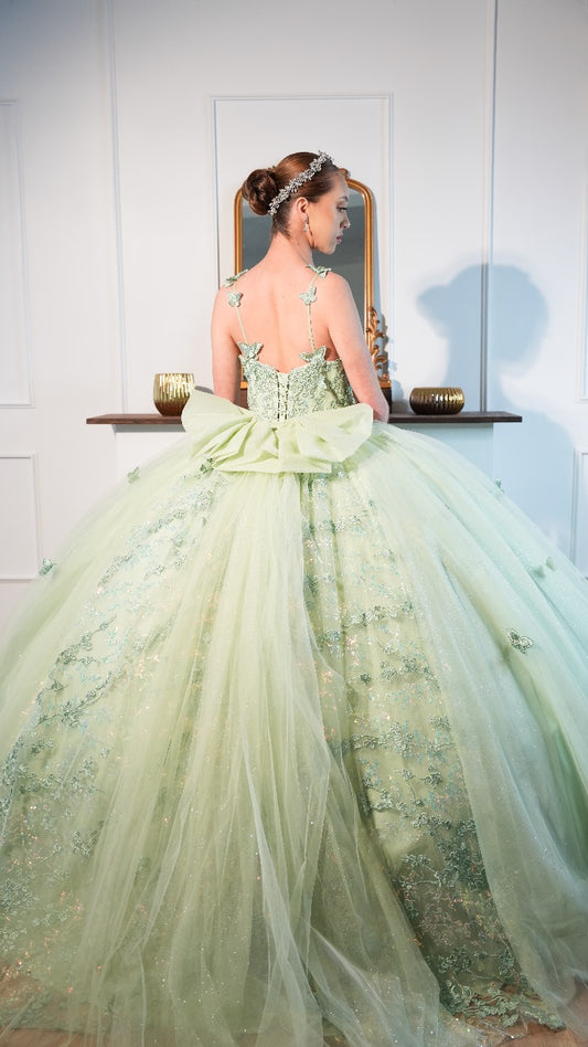 Vestido de XV Años Verde Sage De Mariposas Con Moño Y Tirantes