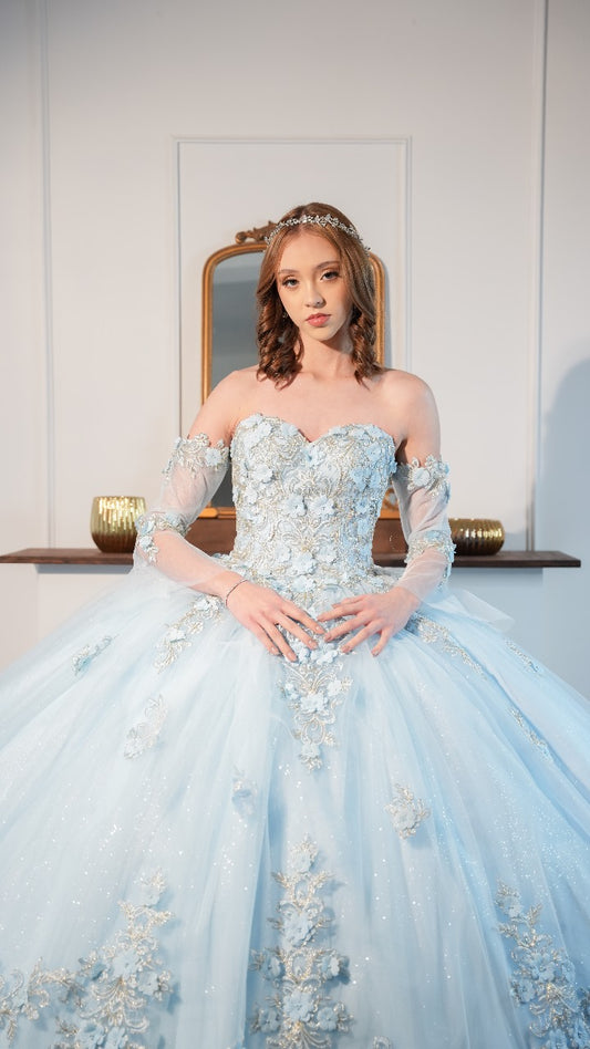 Vestido de XV Años Azul Cielo Bordado De Flores Strapless