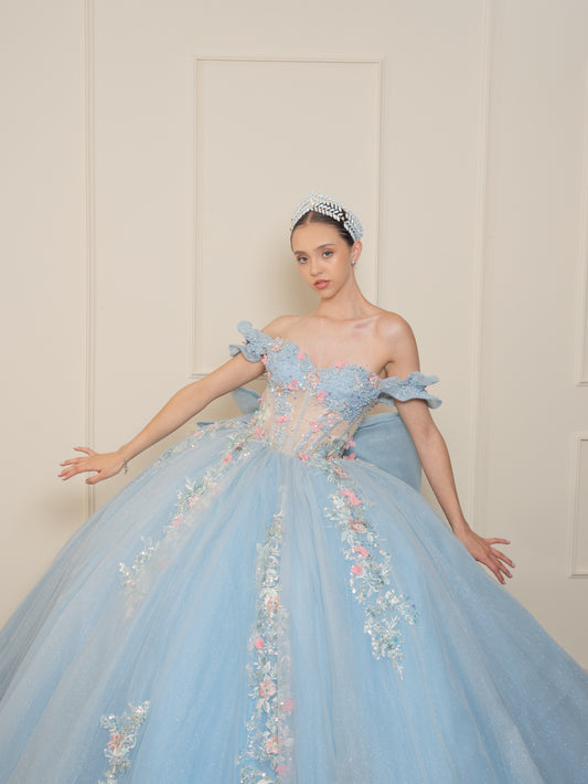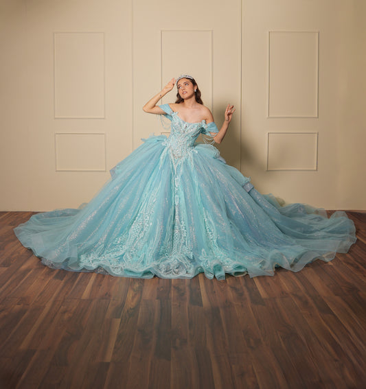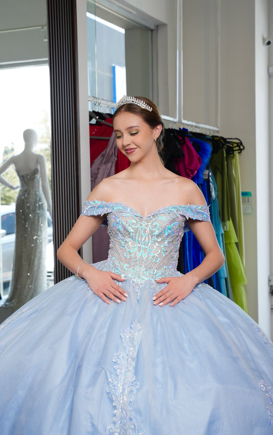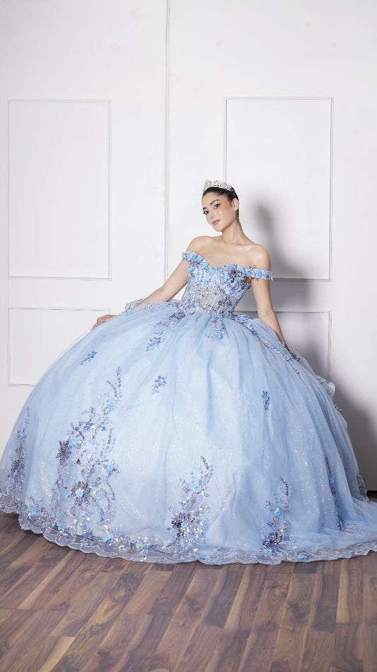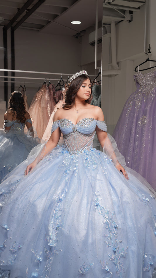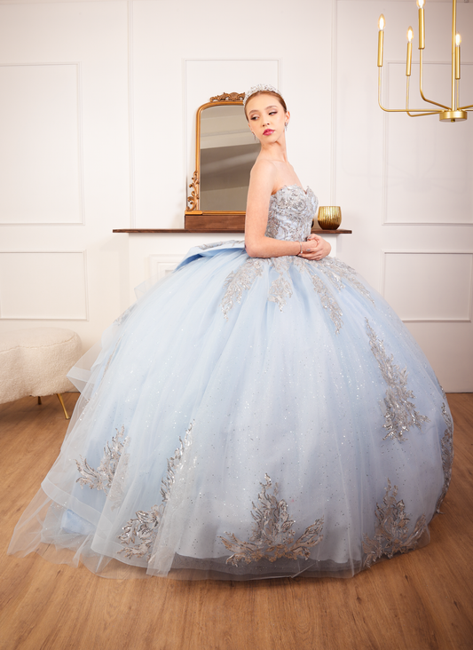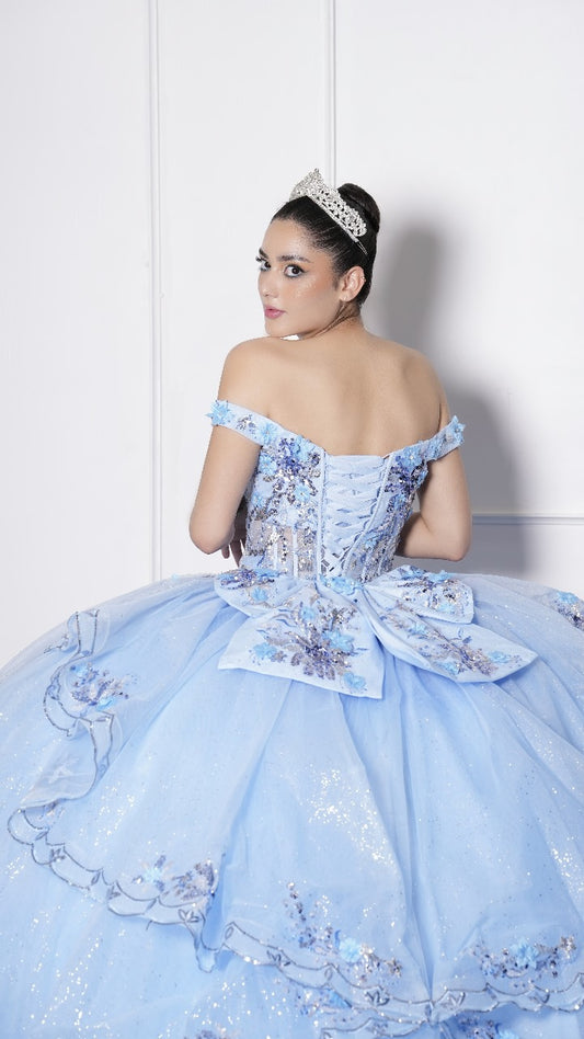 Vestido de XV Años Azul Cielo Glitter Tornasol con Moño