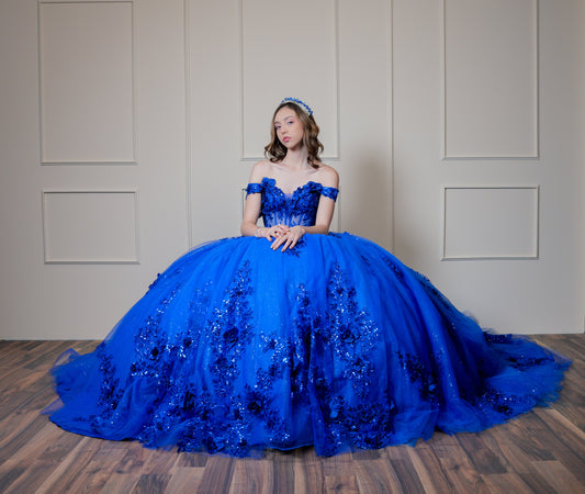 Vestido de XV Años Azul Rey Bordado de Flores con Moño