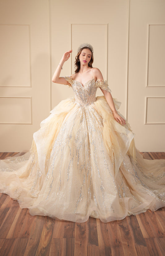 Vestido de XV Años Vestido Plateado Glitter y Pedrería Manga Caída con Cauda