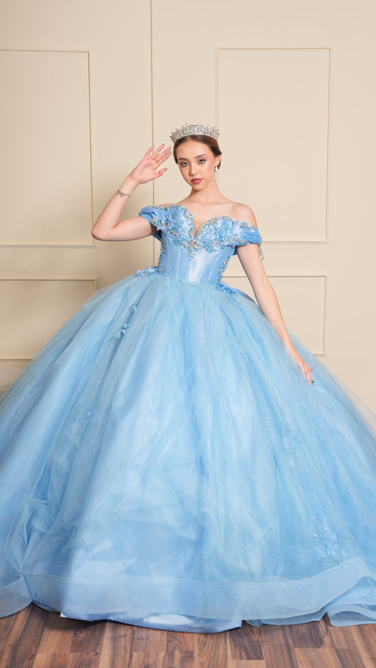 Vestido de XV Años Azul Cielo Encaje Flores Mangas Campesinas Piedras Pecho (Renta)