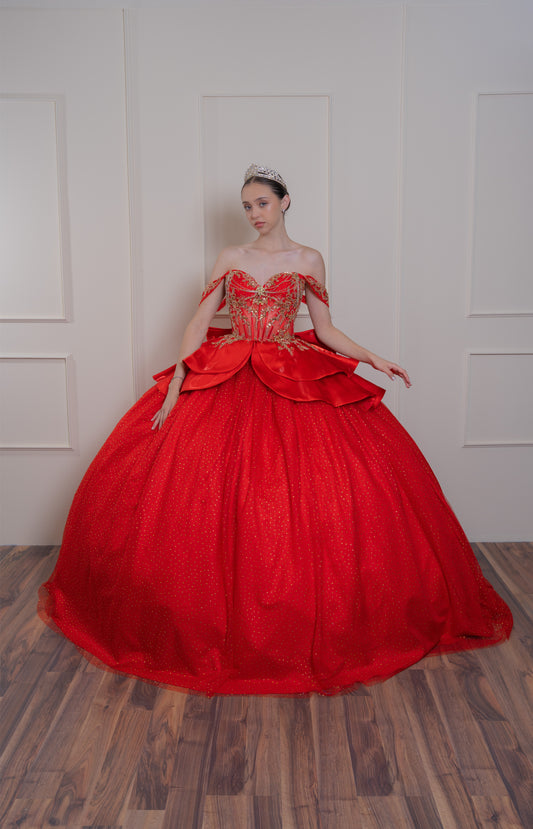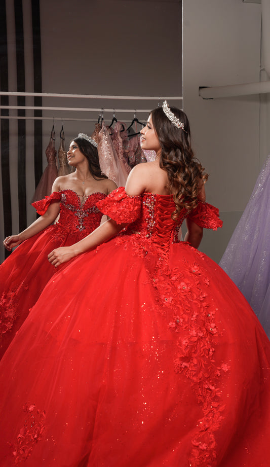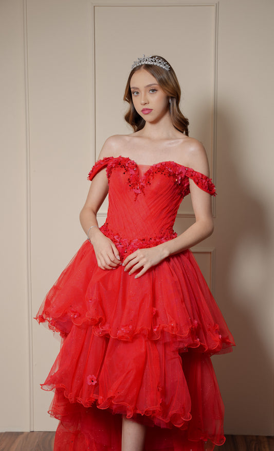 Vestido de XV Años Rojo Flores y Pedrería Manga Caída y Cauda (Renta)