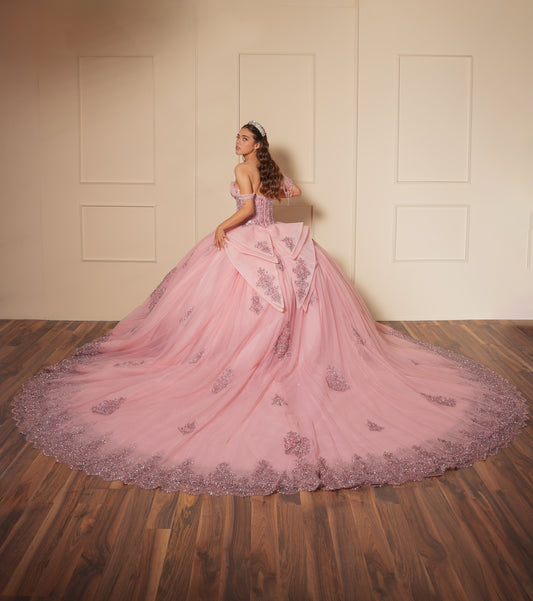Vestido de XV Años Rosa Blush Con Glitter Plata y Moño Matte