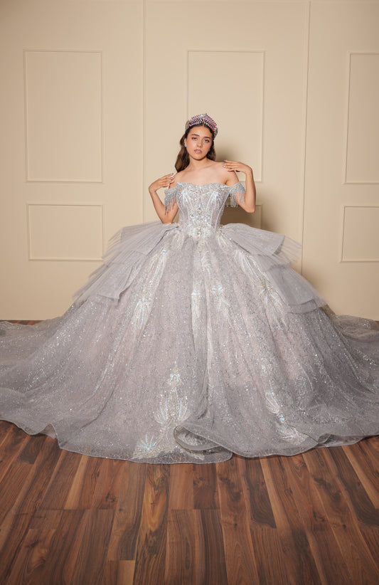 Vestido de XV Años Plateado con Pedrería y Cadenas en Mangas Caídas