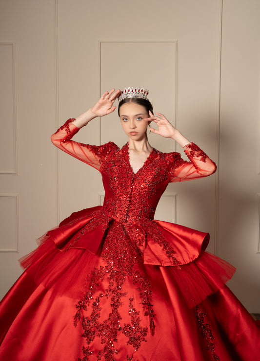 Vestido de XV Años Rojo de Manga Larga con Cauda y Espalda Descubierta