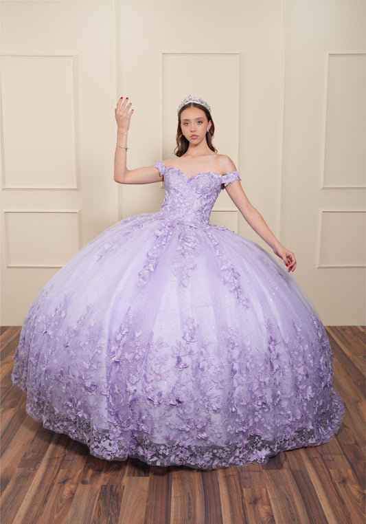 Vestido de XV Años Lila Bordado Mariposas Mangas Caídas con Velo