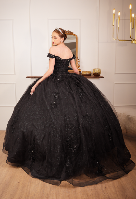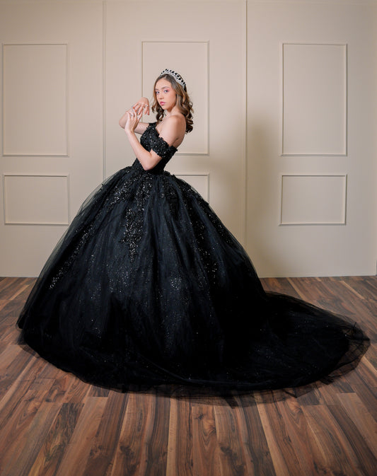 Vestido de XV Años Negro Bordado Con Manga Caída Corset Transparencia