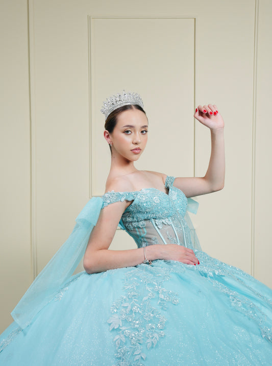 Vestido de XV Años Menta Bordado con Mangas de Moño