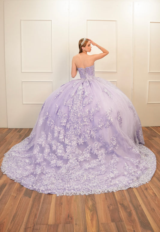 Vestido de XV años Lila Encaje Bordado con Mangas Amponas y Cola (Renta)
