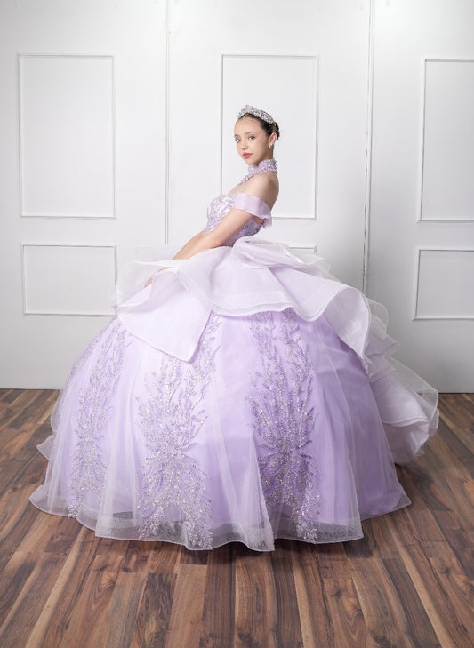 Vestido de XV Años Lila Pedrería con Olanes Blancos y Gargantilla