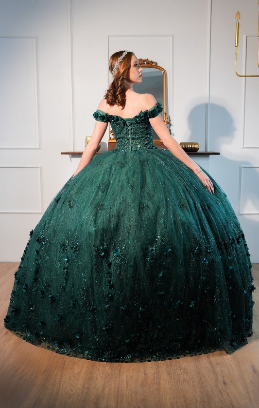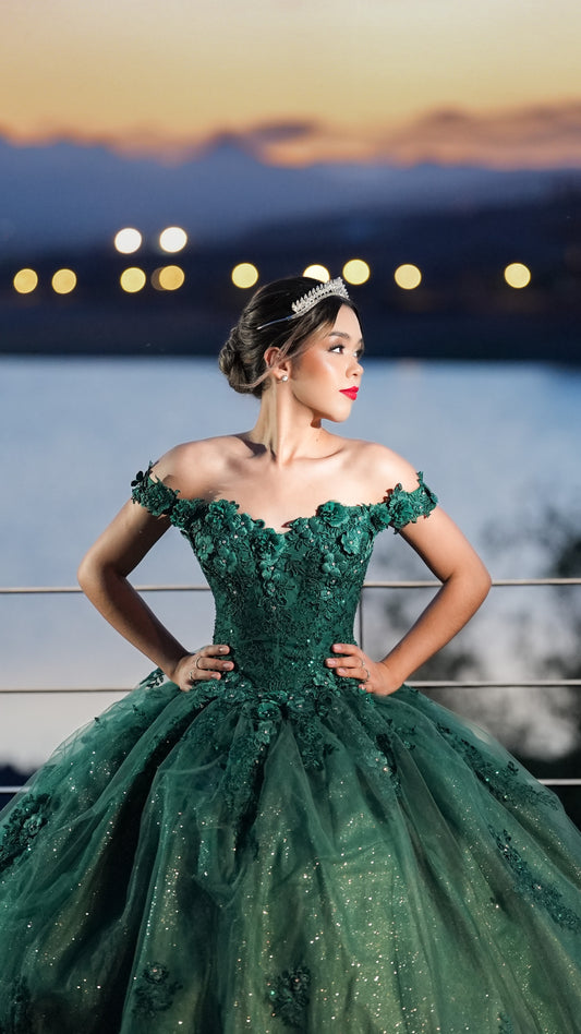 Vestido de XV Años Verde Esmeralda Con Flores Bordadas Manga CampesinaPrecio habitual $ 16,105.00 MXNPrecio habitualPrecio unitario / por-