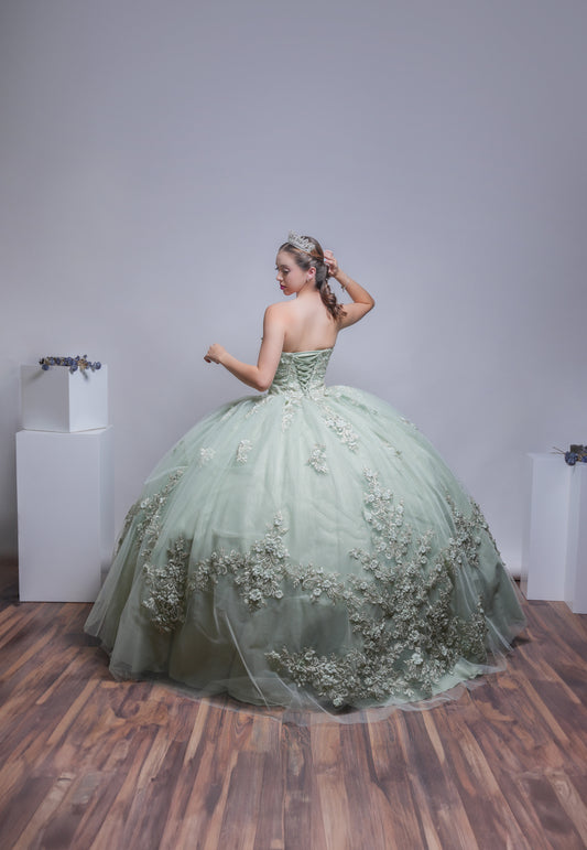 Vestido de XV Años Verde Sage Bordado De Flores Strapless (Renta)Precio habitual $ 6,000.00 MXNPrecio habitualPrecio unitario / por-