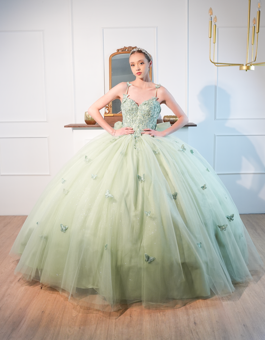 Vestido de XV Años Verde Sage de Mariposas con Moño y Tirantes (Renta)Precio habitual $ 6,000.00 MXNPrecio habitualPrecio unitario / por-