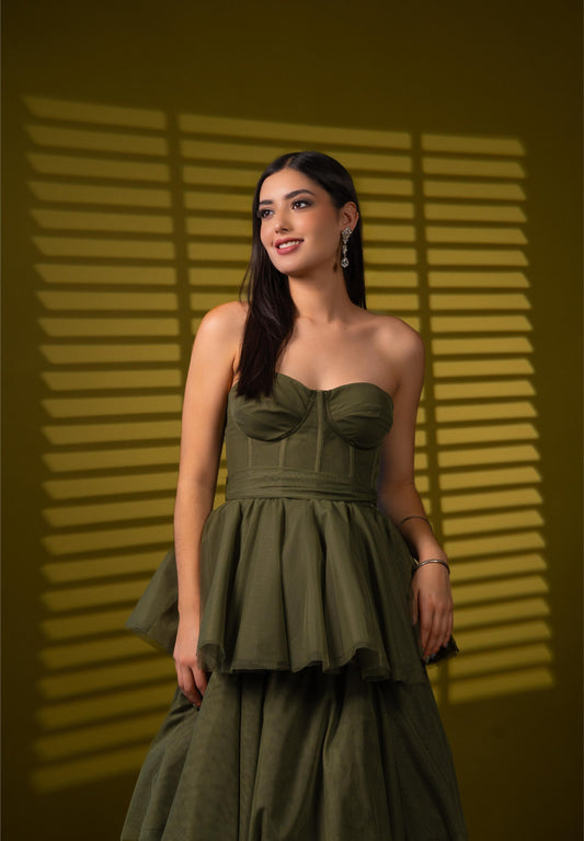 Vestido Verde Olivo Corset Straple Falda De Tablones
