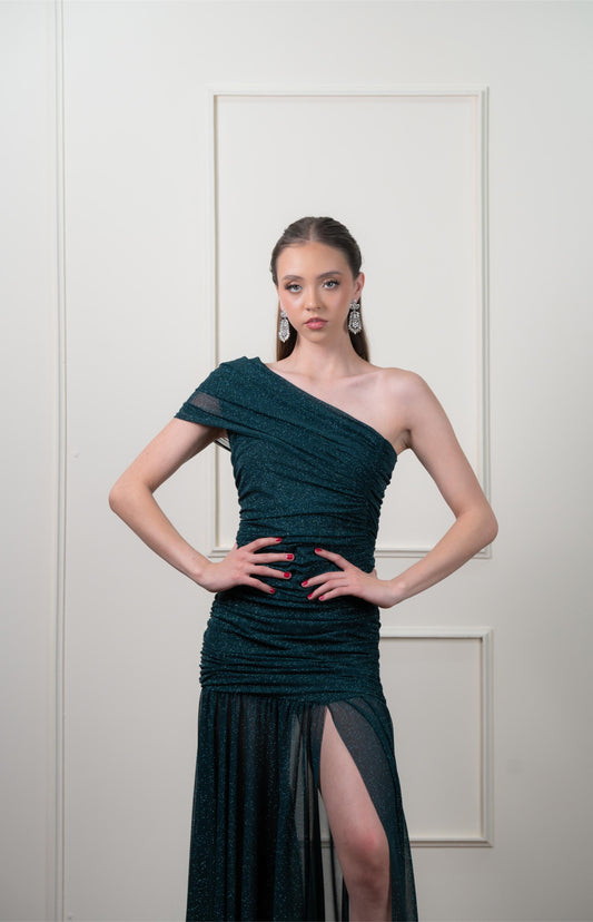 Vestido Verde Manga Larga Corrugado En Abdomen Falda Lisa
