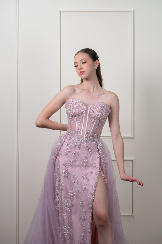 Vestido Rosa Straple Pedreria Flores Y Capa