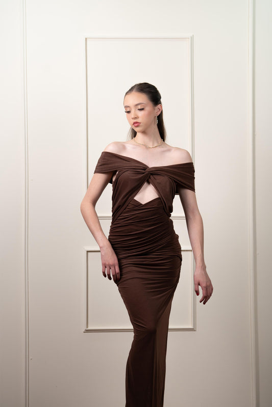 Vestido Vino Satin Escote Caido Espalda Descubierta