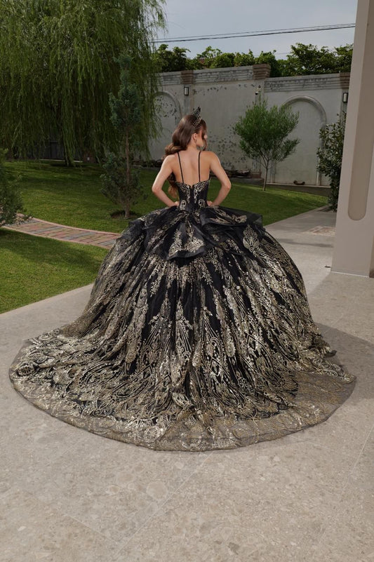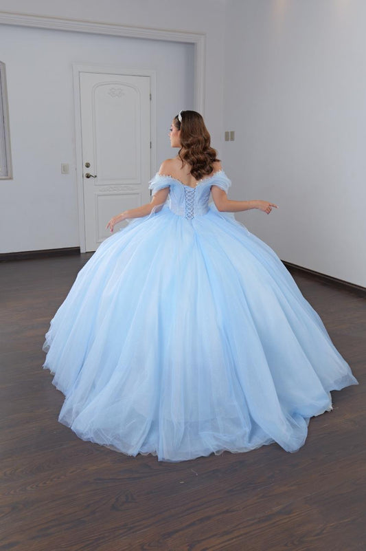 Vestido de XV Años Azul Cielo con Glitter Plateado Cauda con Olan