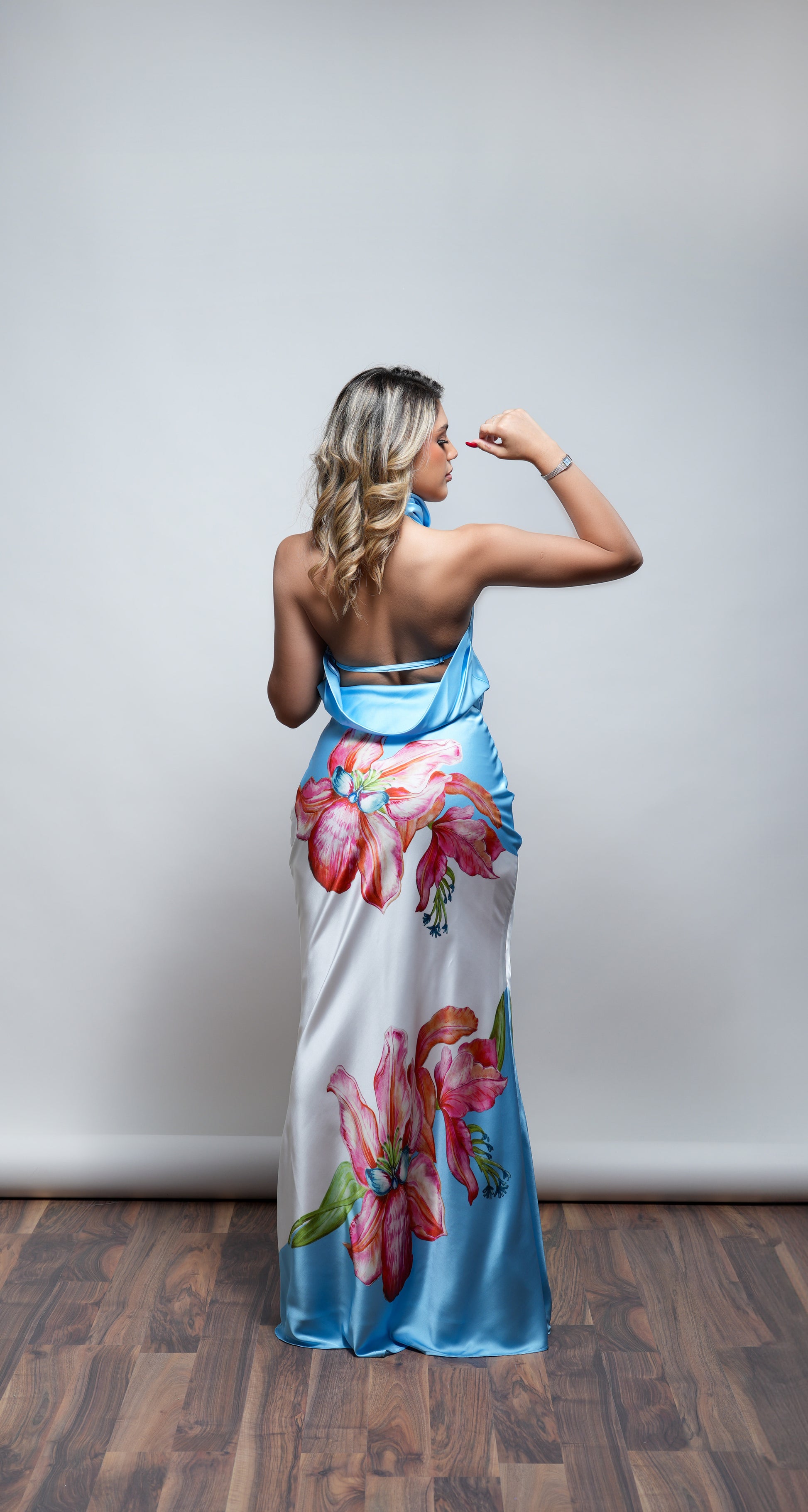 Vestido Azul Cuello Halter Con Flores Rosas
