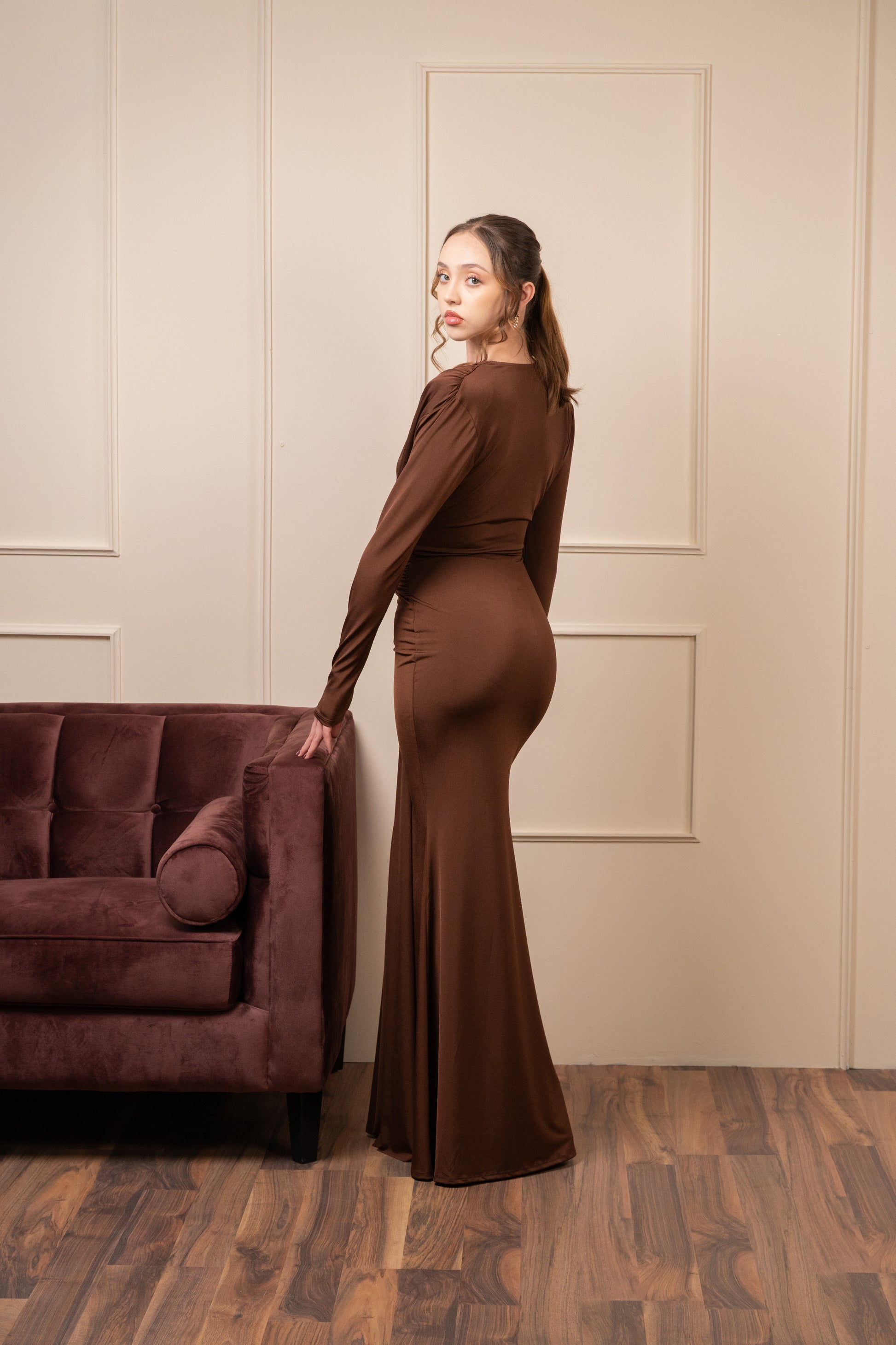Vestido Cafe Manga Larga Corrugado En Cintura