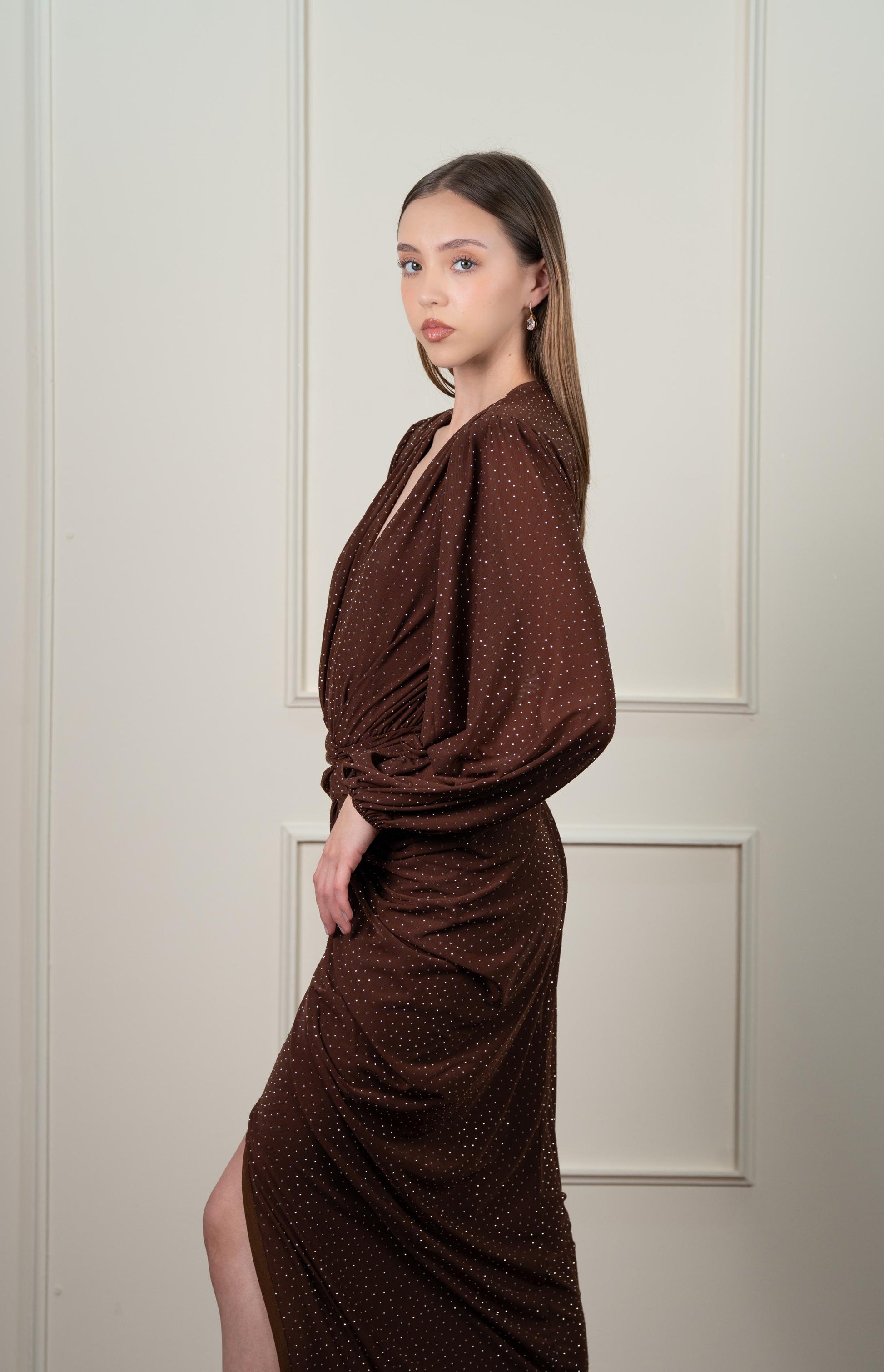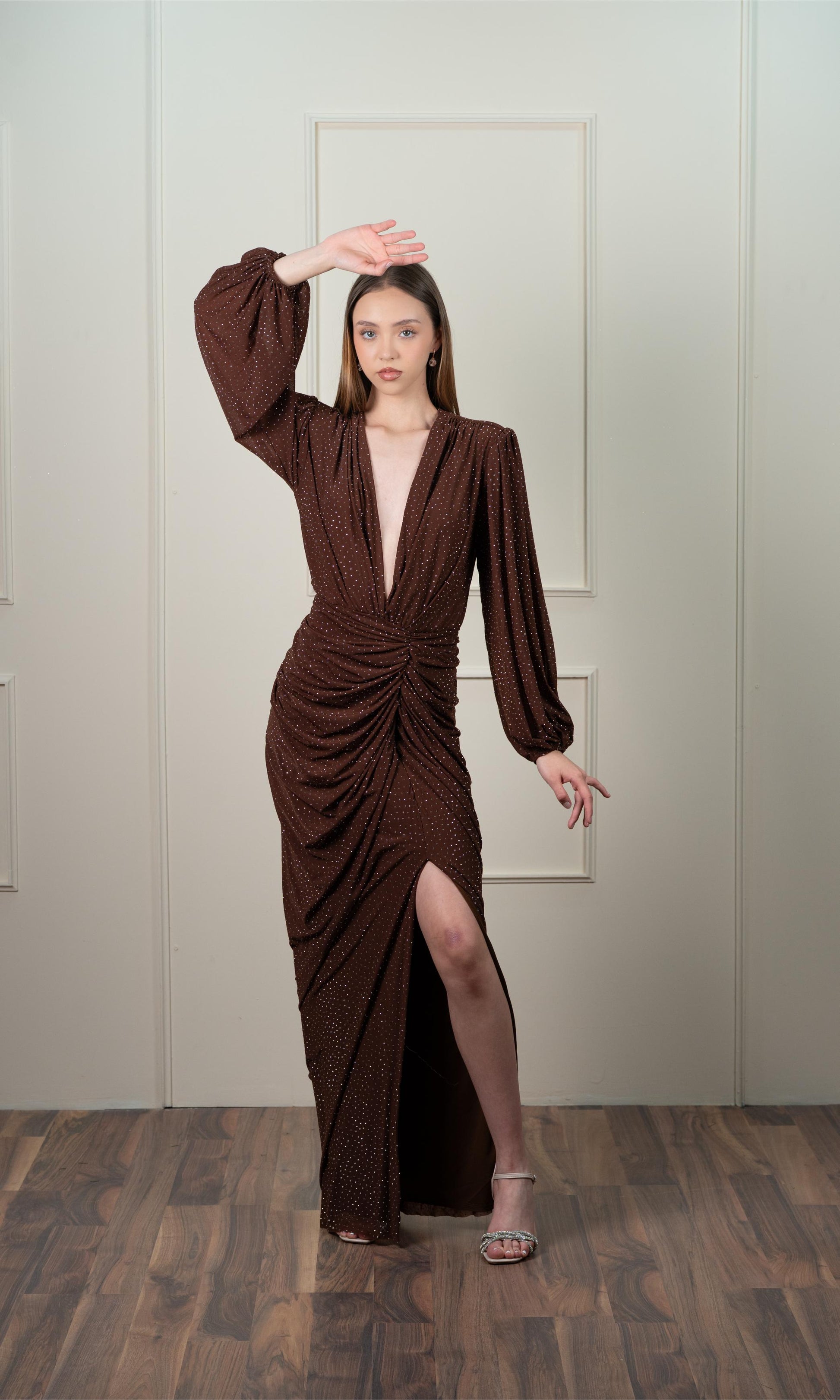 Vestido Con Brillos Manga Larga Corrugado En Cintura