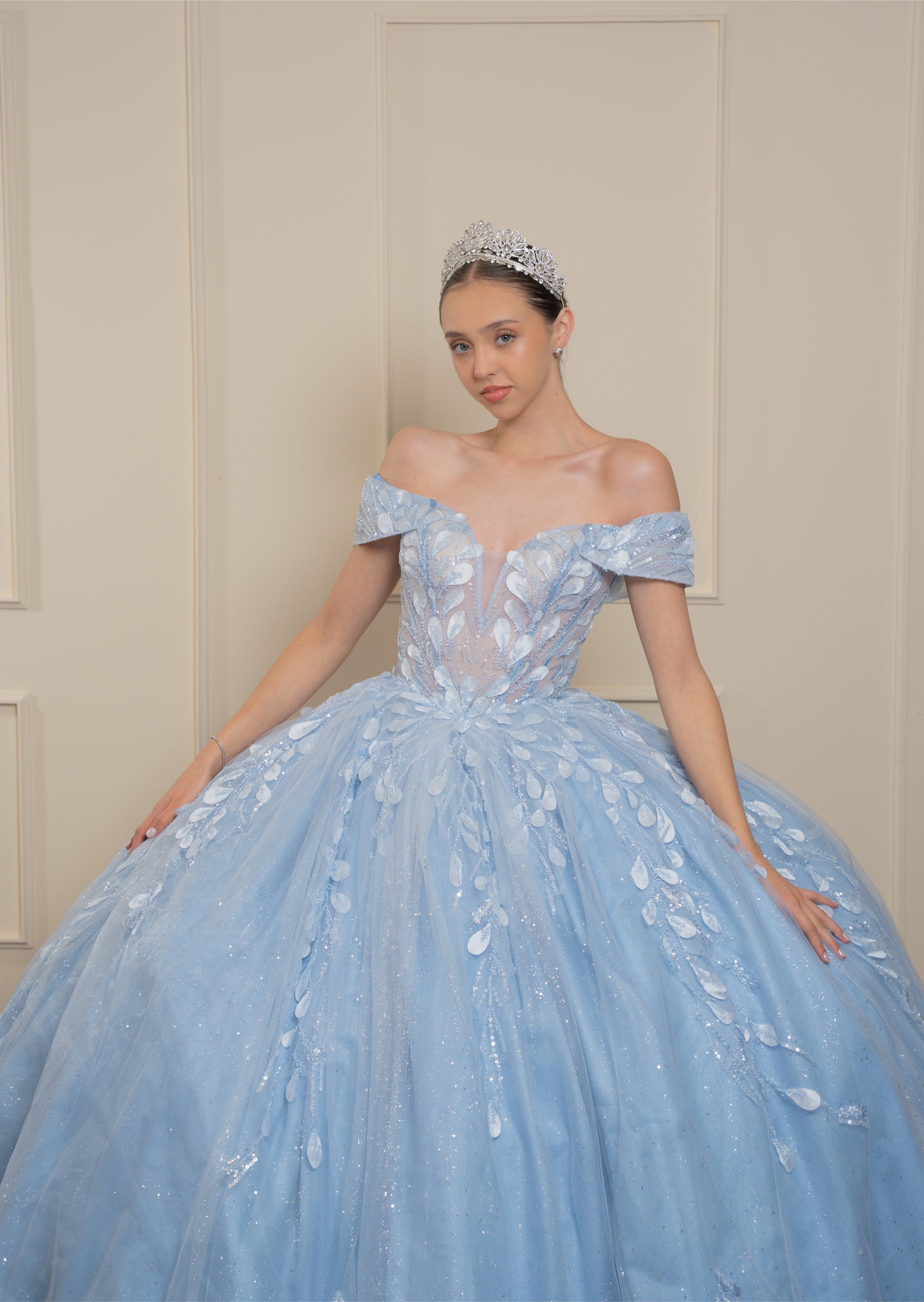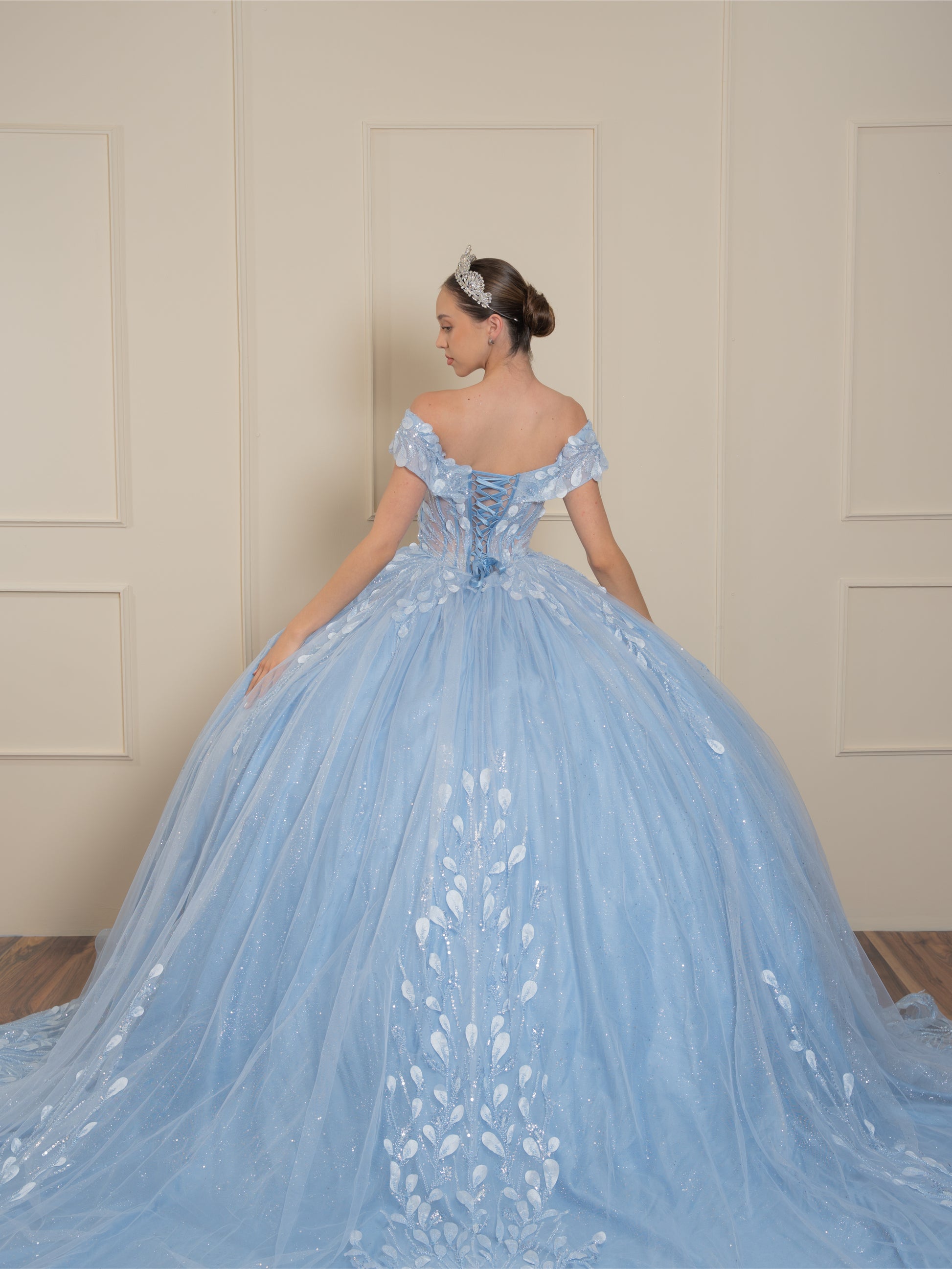 Vestido de XV Años Azul Baby Con Hojas Plateadas Mangas Campesinas