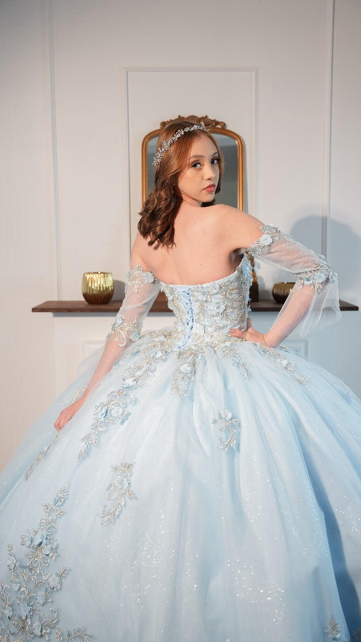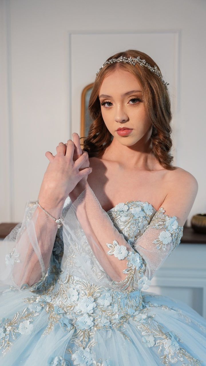Vestido de XV Años Azul Cielo Bordado De Flores Strapless
