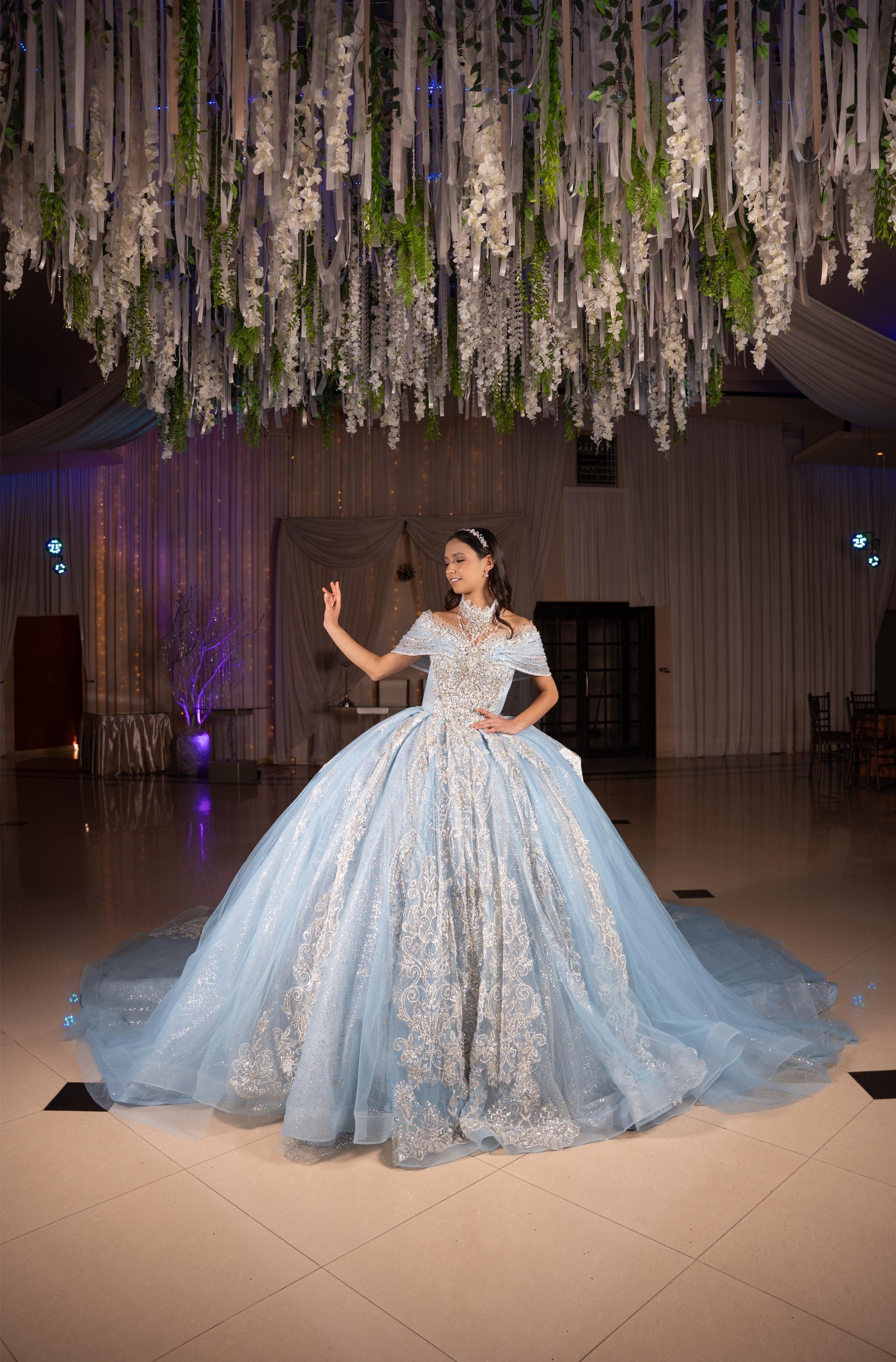 Vestido de XV Años Azul Cielo con Glitter Plateado Cauda con Olan