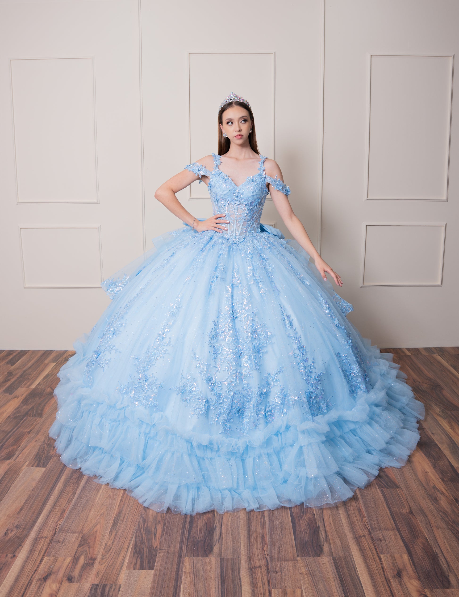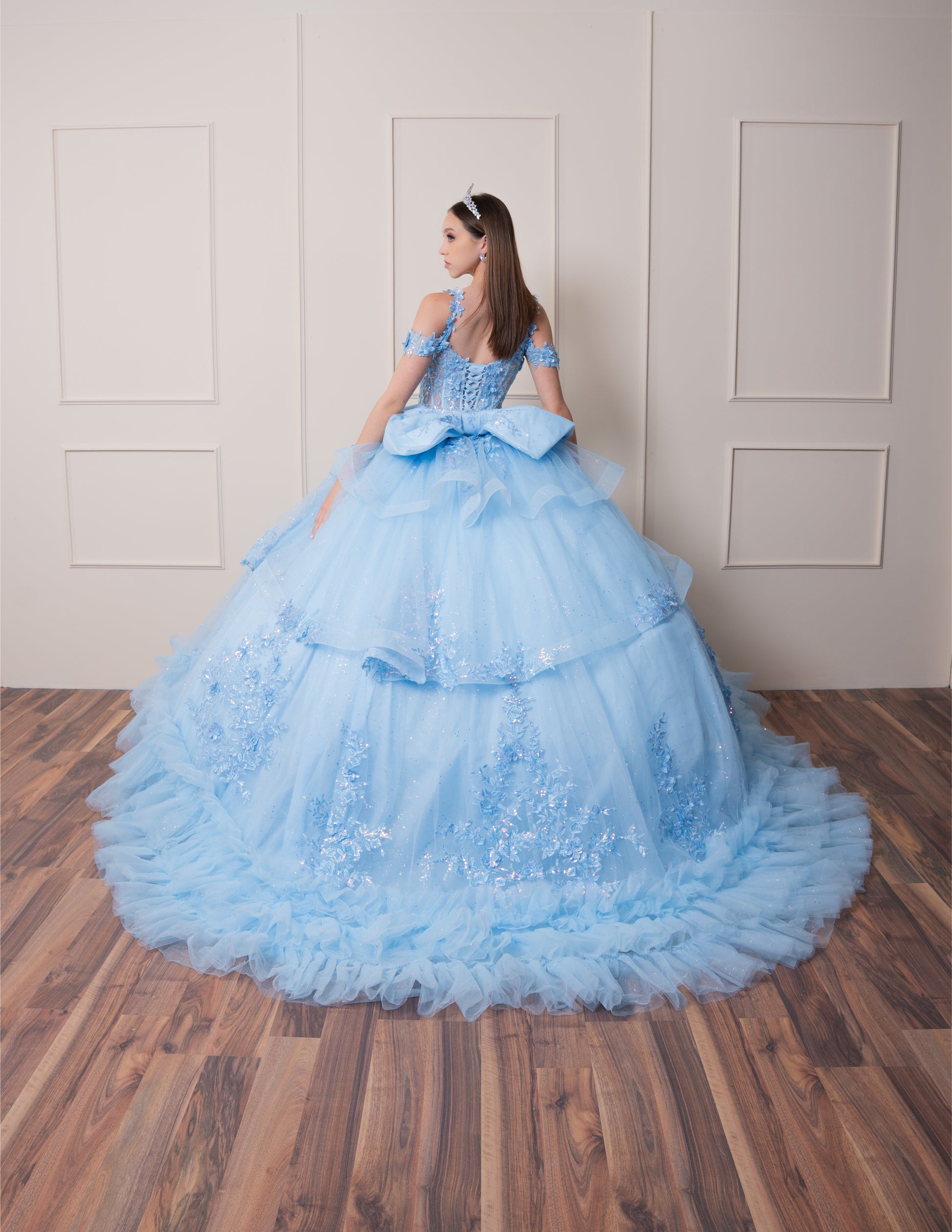 Vestido de XV Años Azul Cielo Olanes en Falda Tirantes y Manga Caída