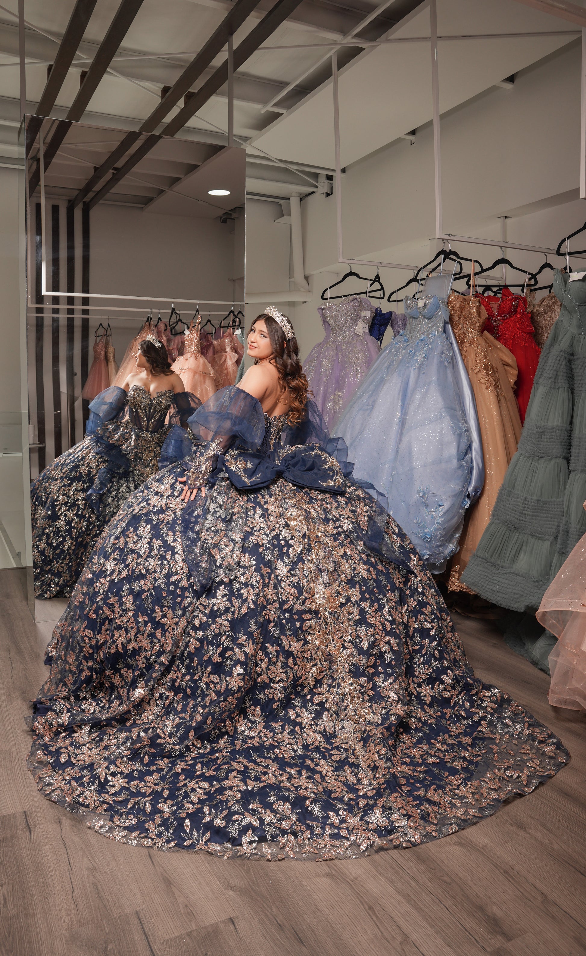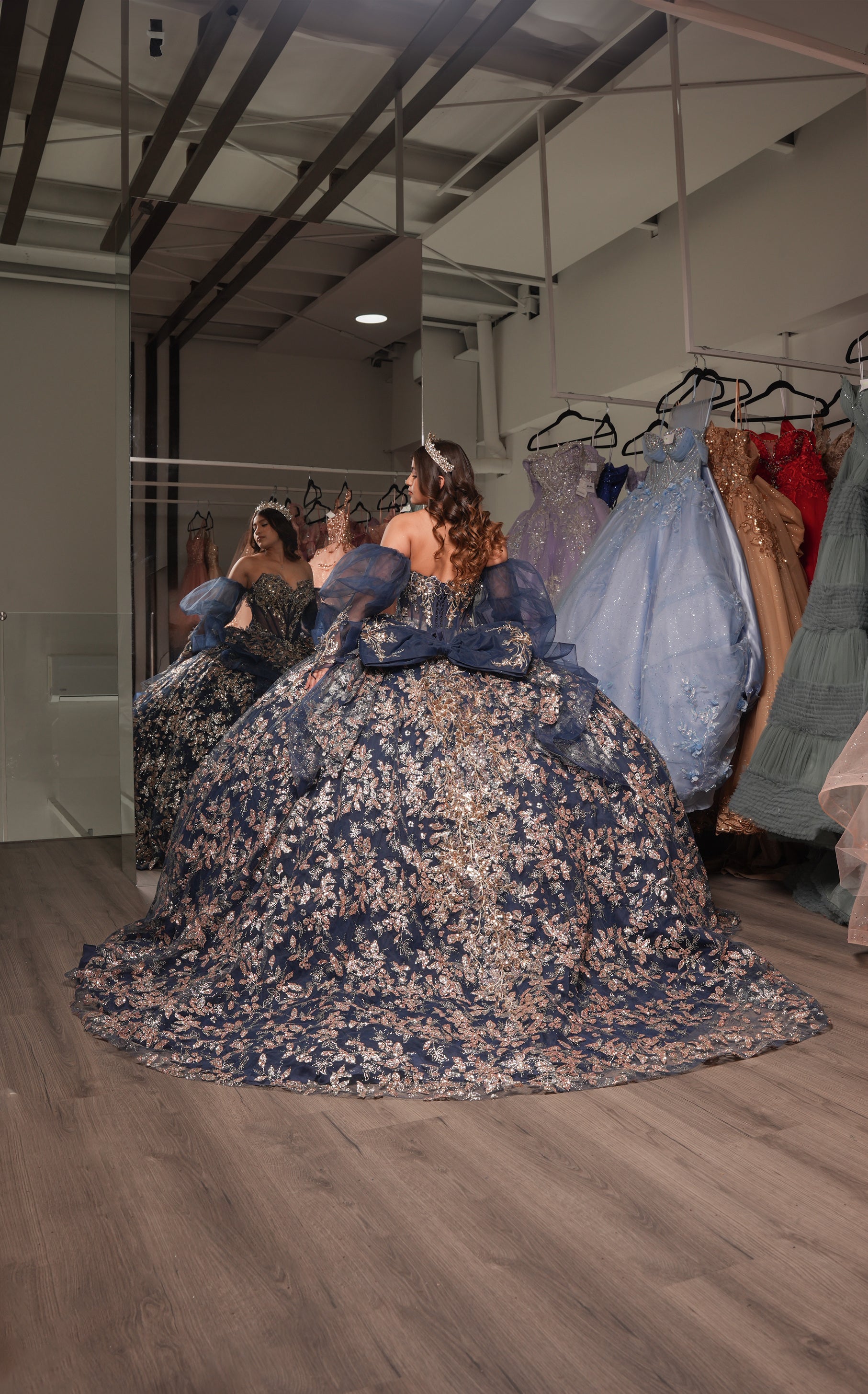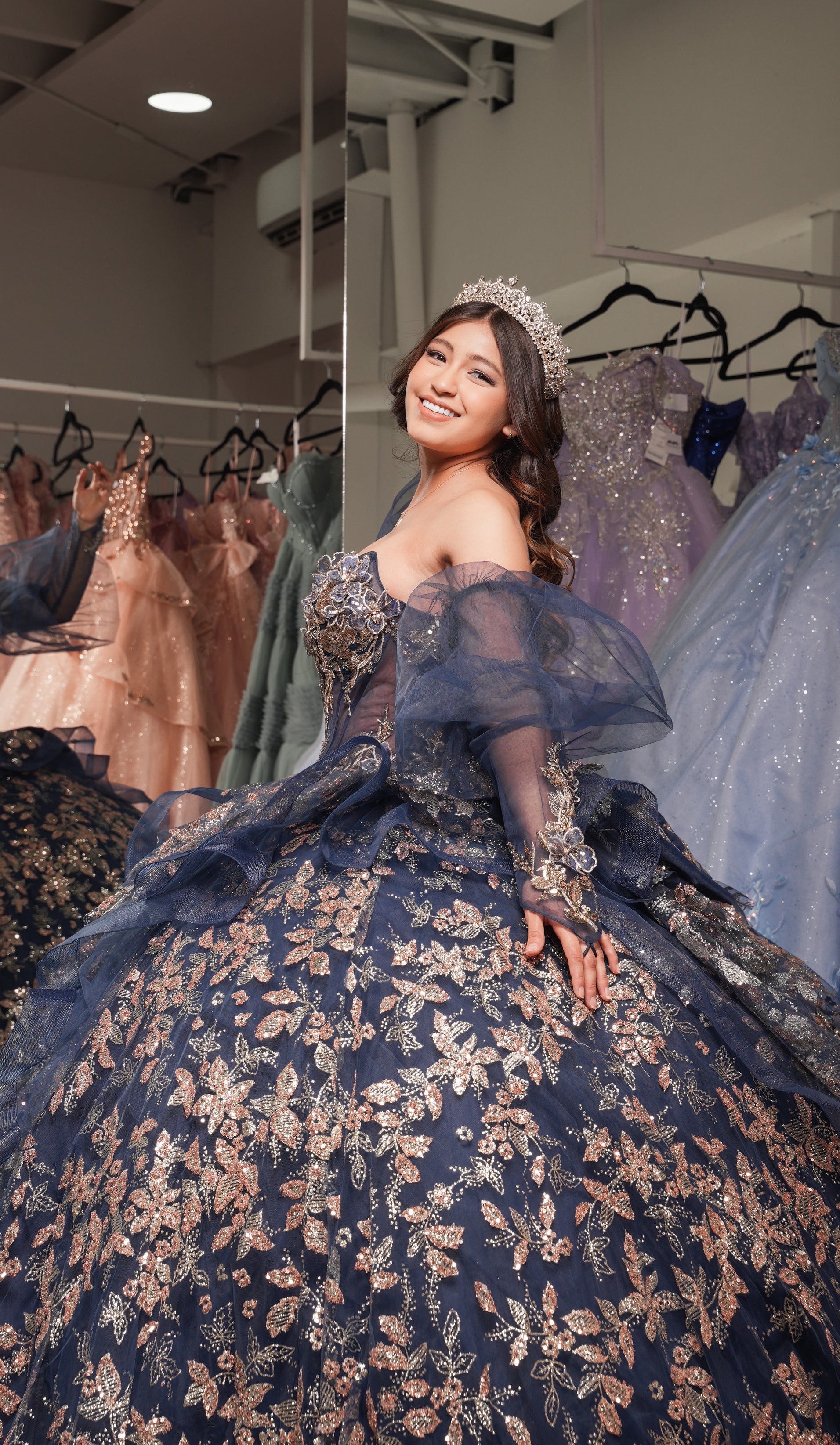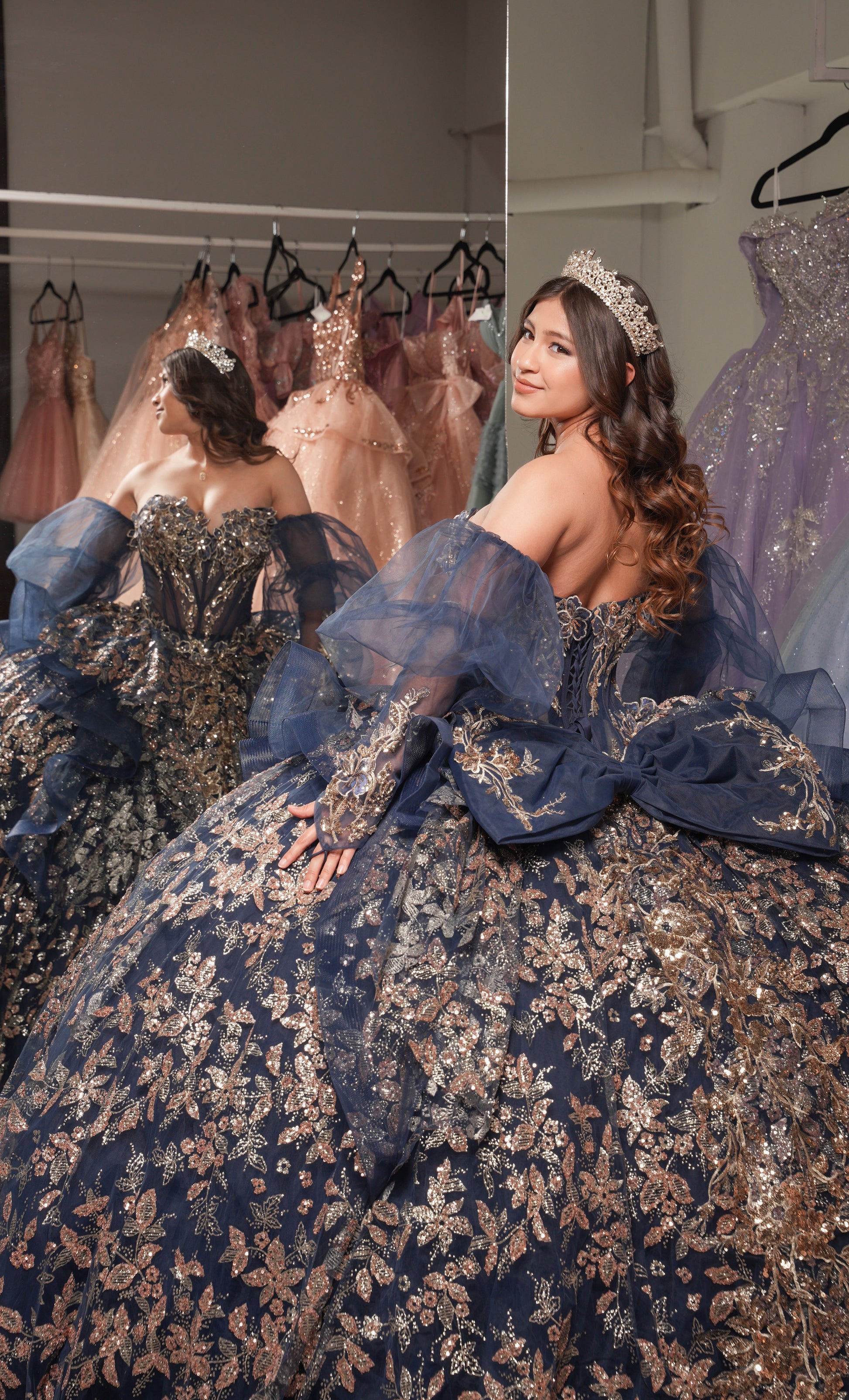 Vestido de XV Años Azul Marino con Dorado Moño y Mangas Amponas