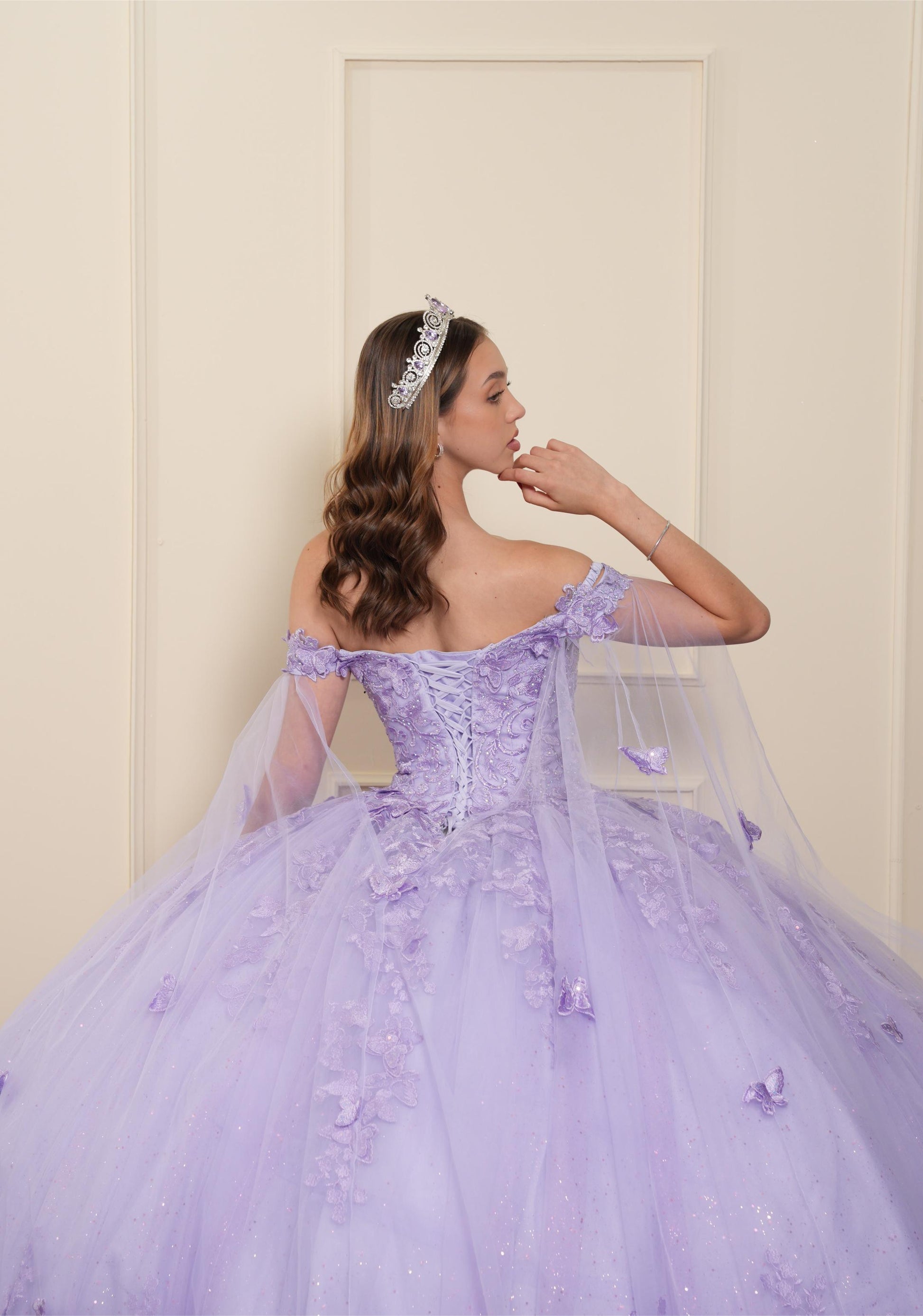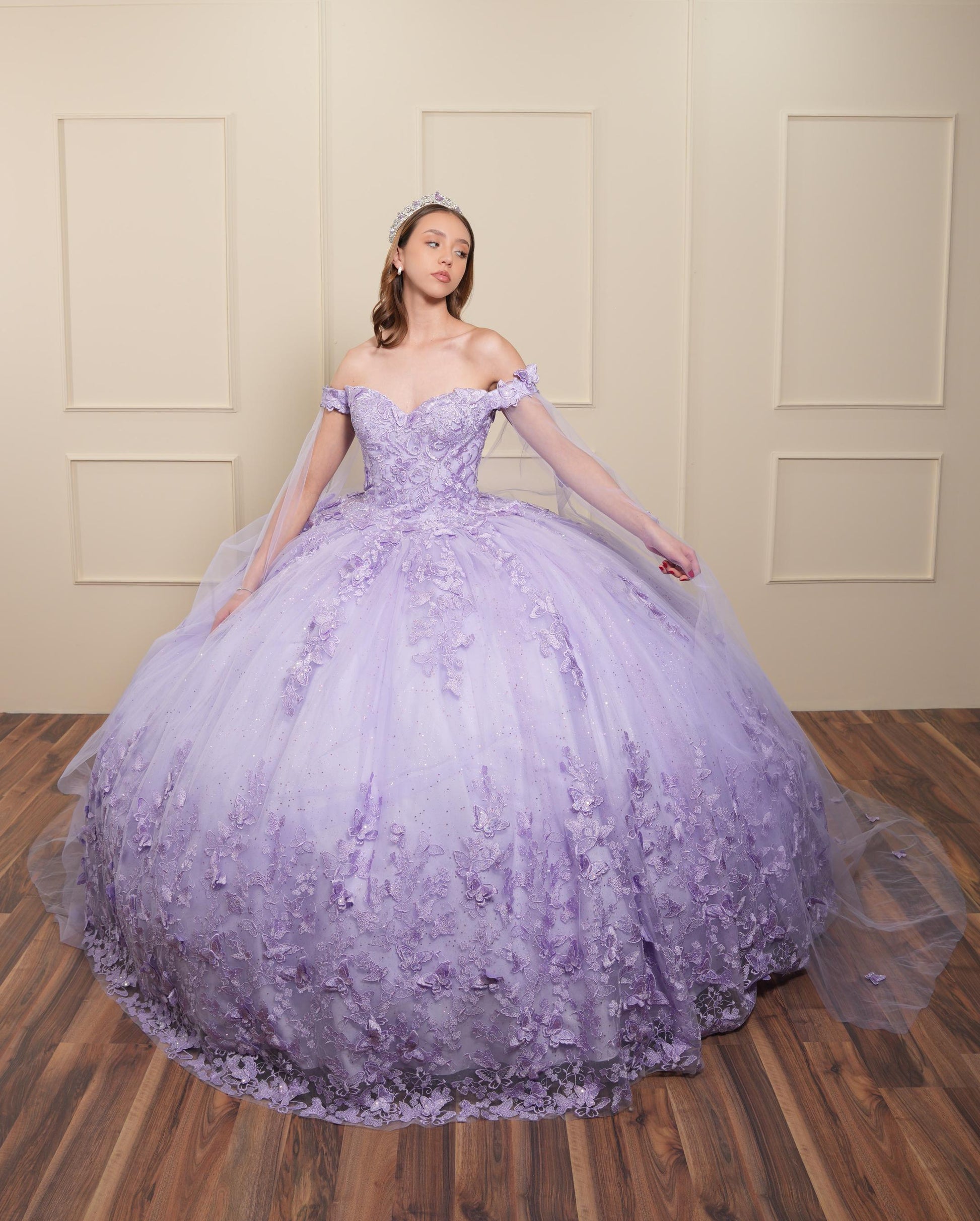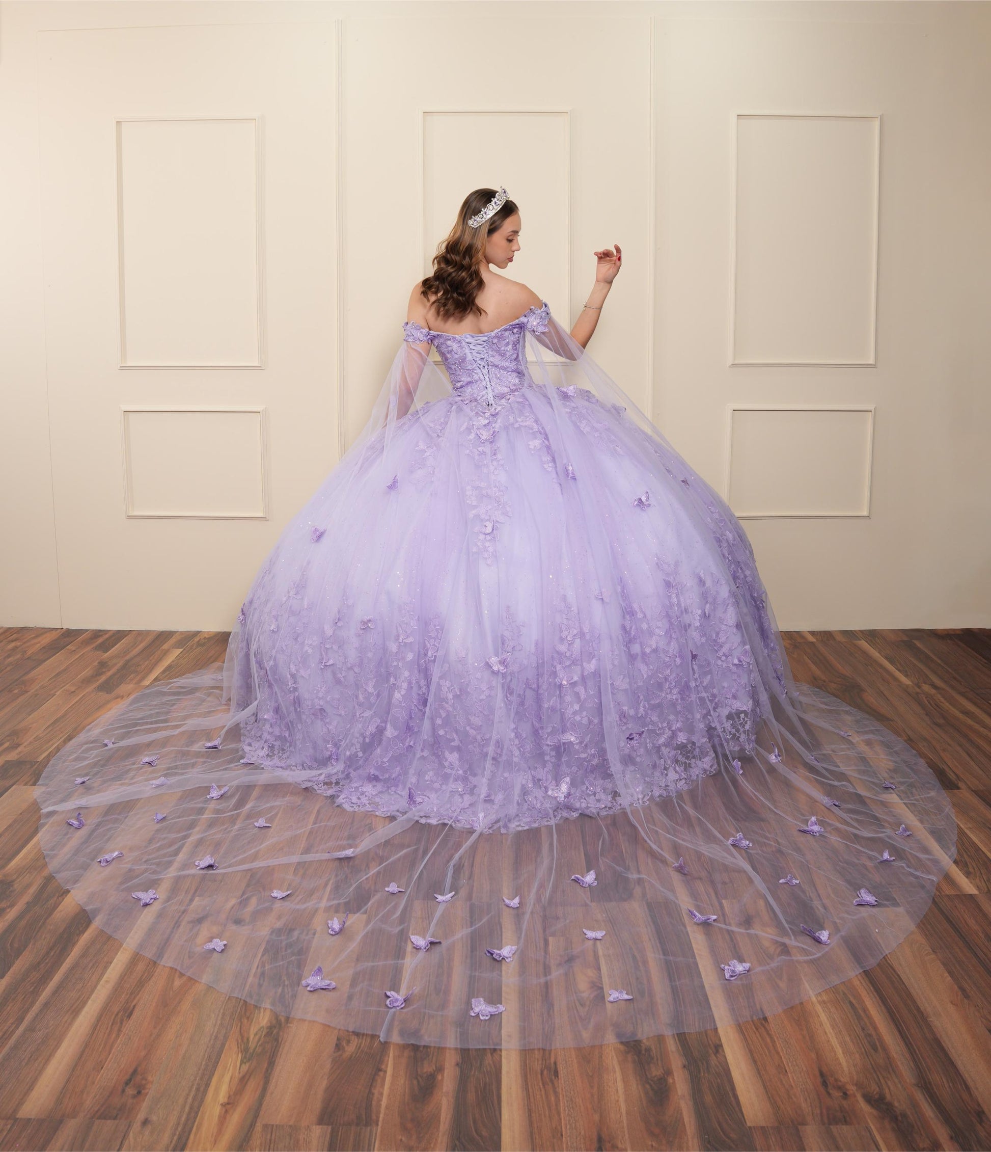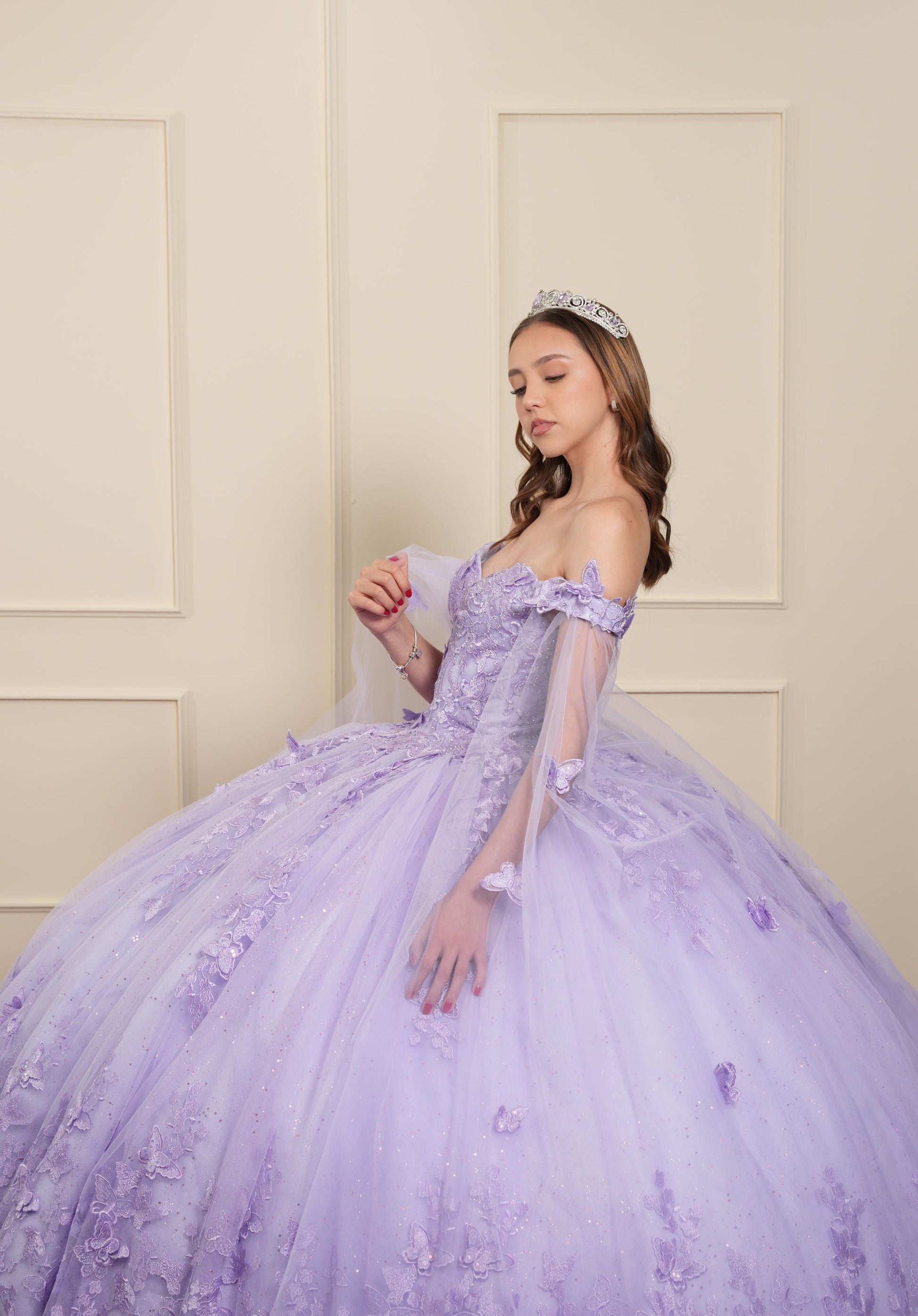 Vestido de XV Años Lila Bordado Mariposas Mangas Caídas con Velo