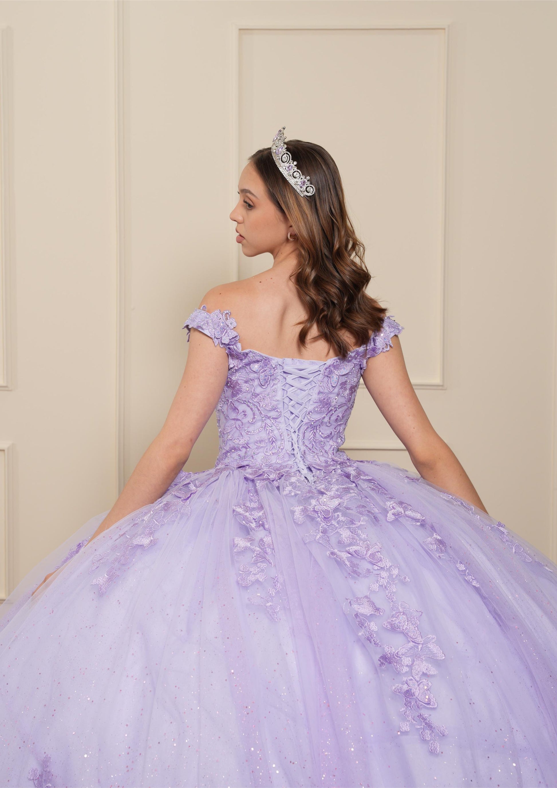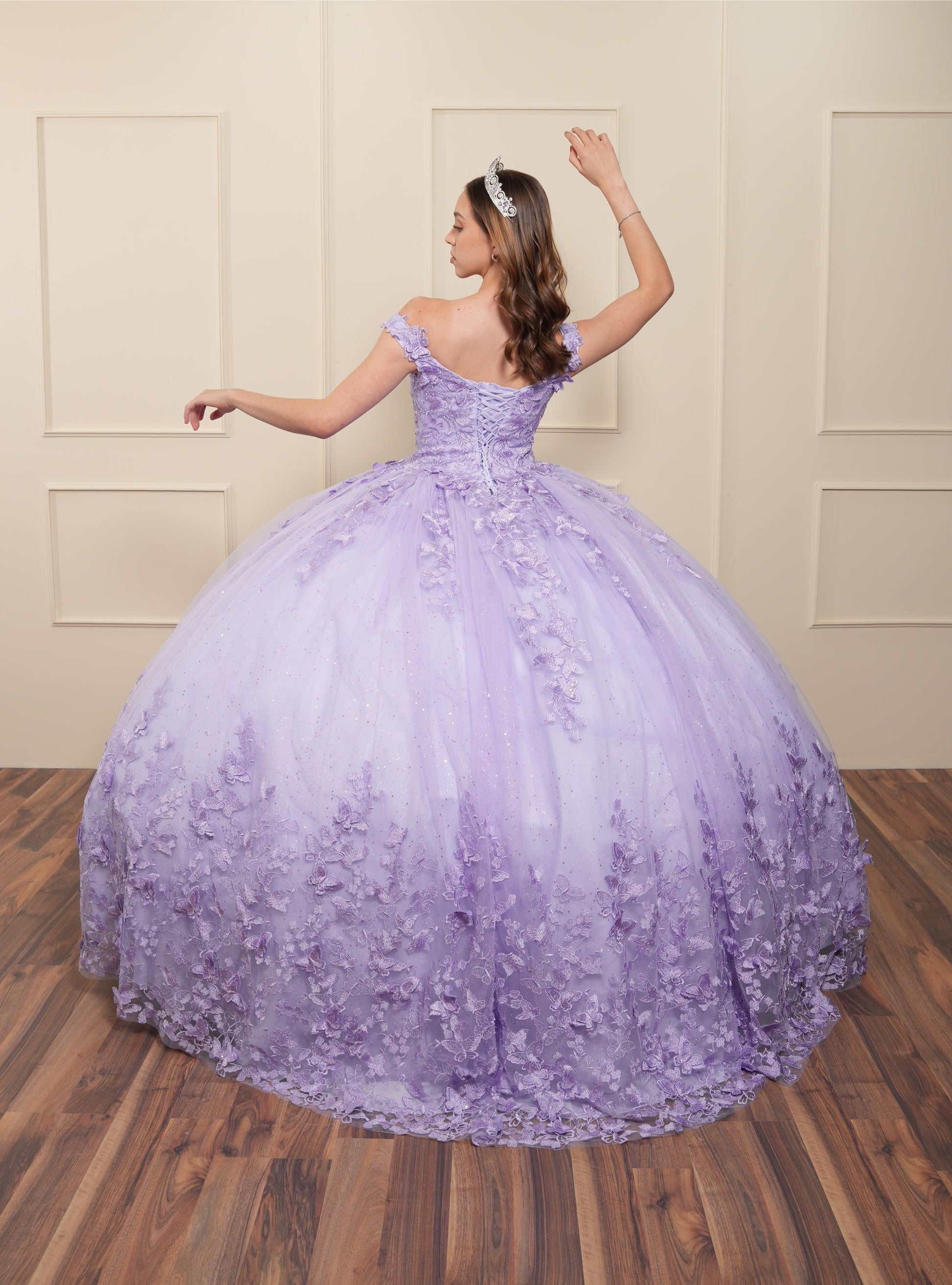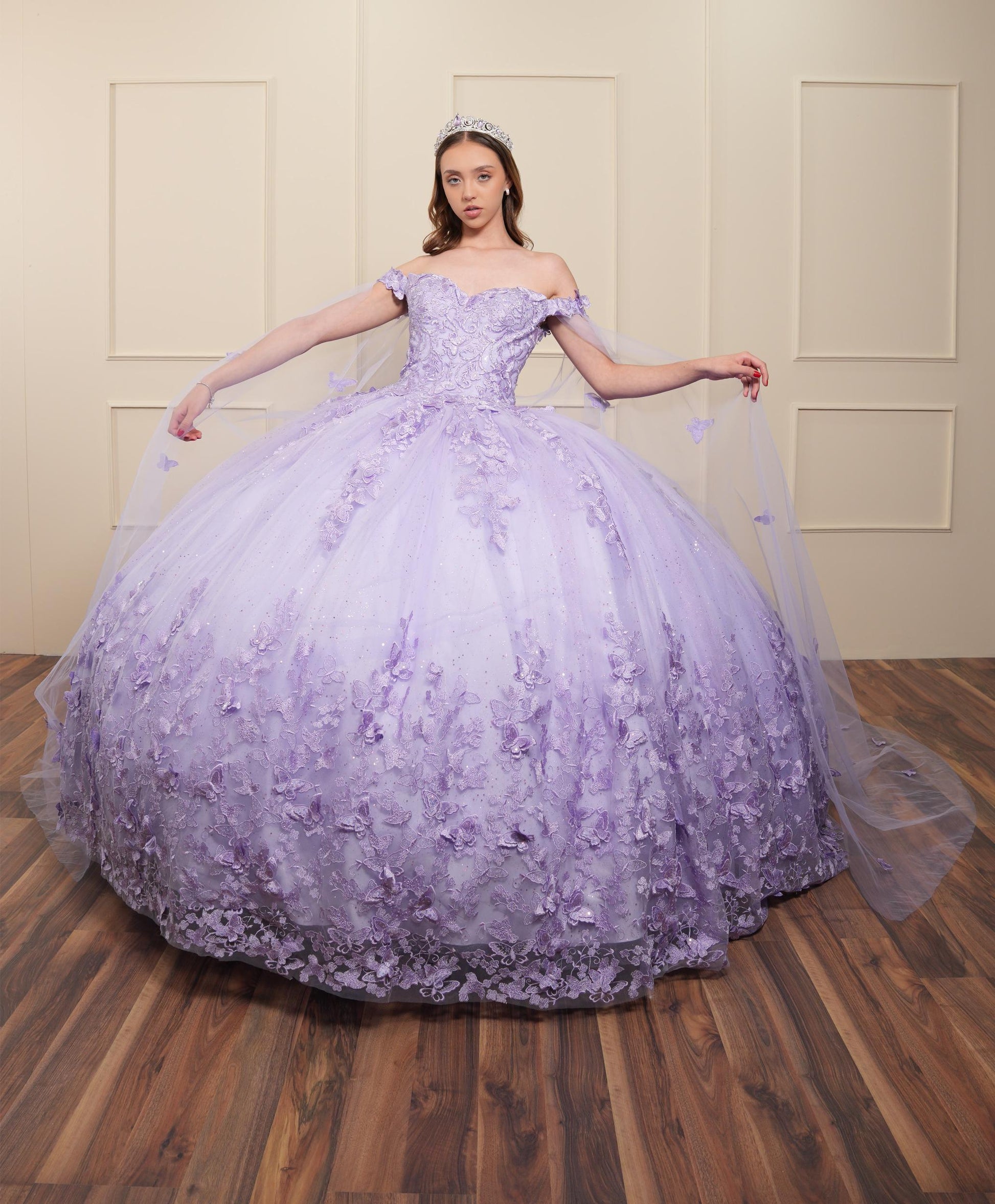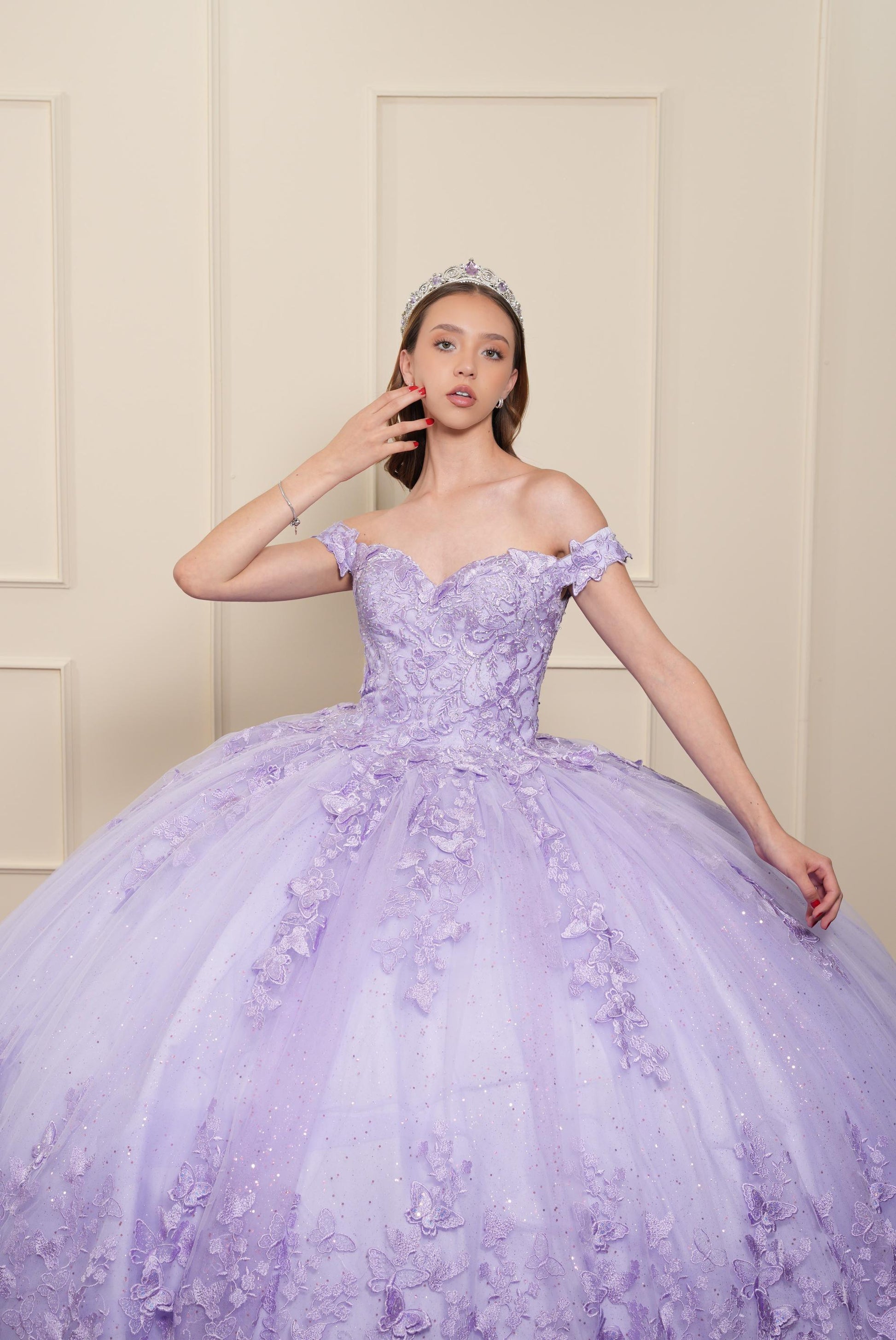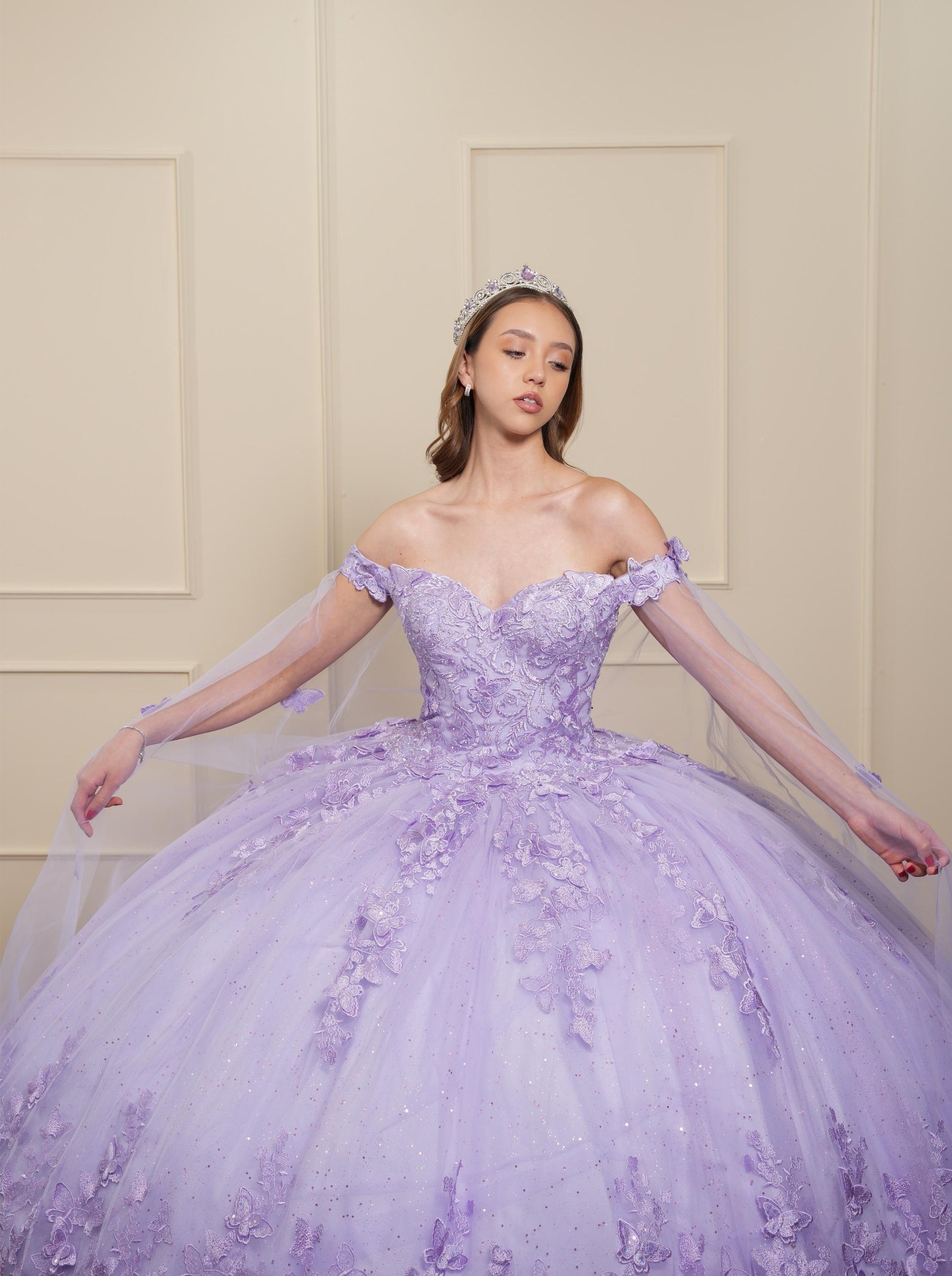 Vestido de XV Años Lila Bordado Mariposas Mangas Caídas con Velo