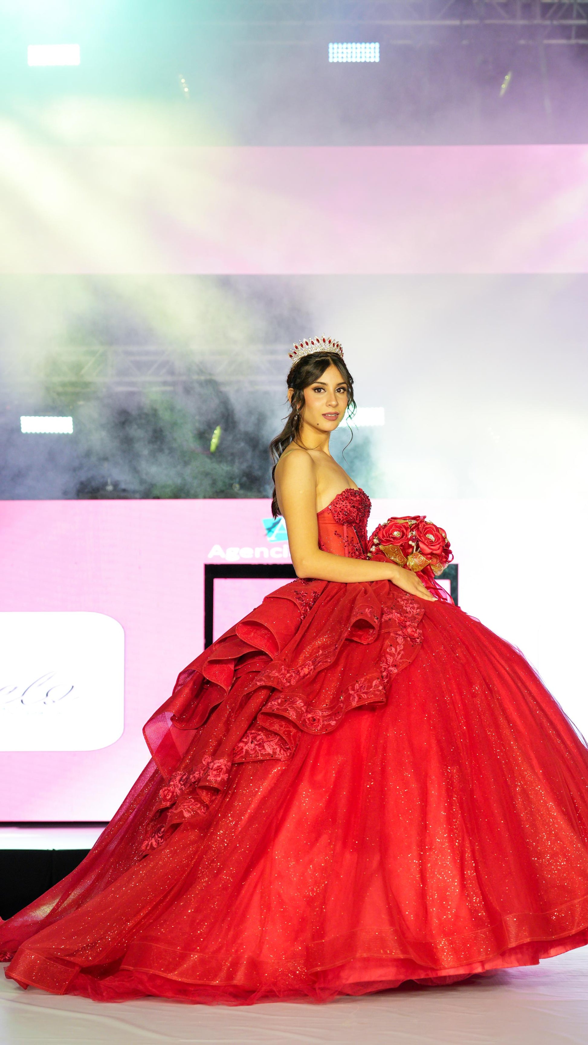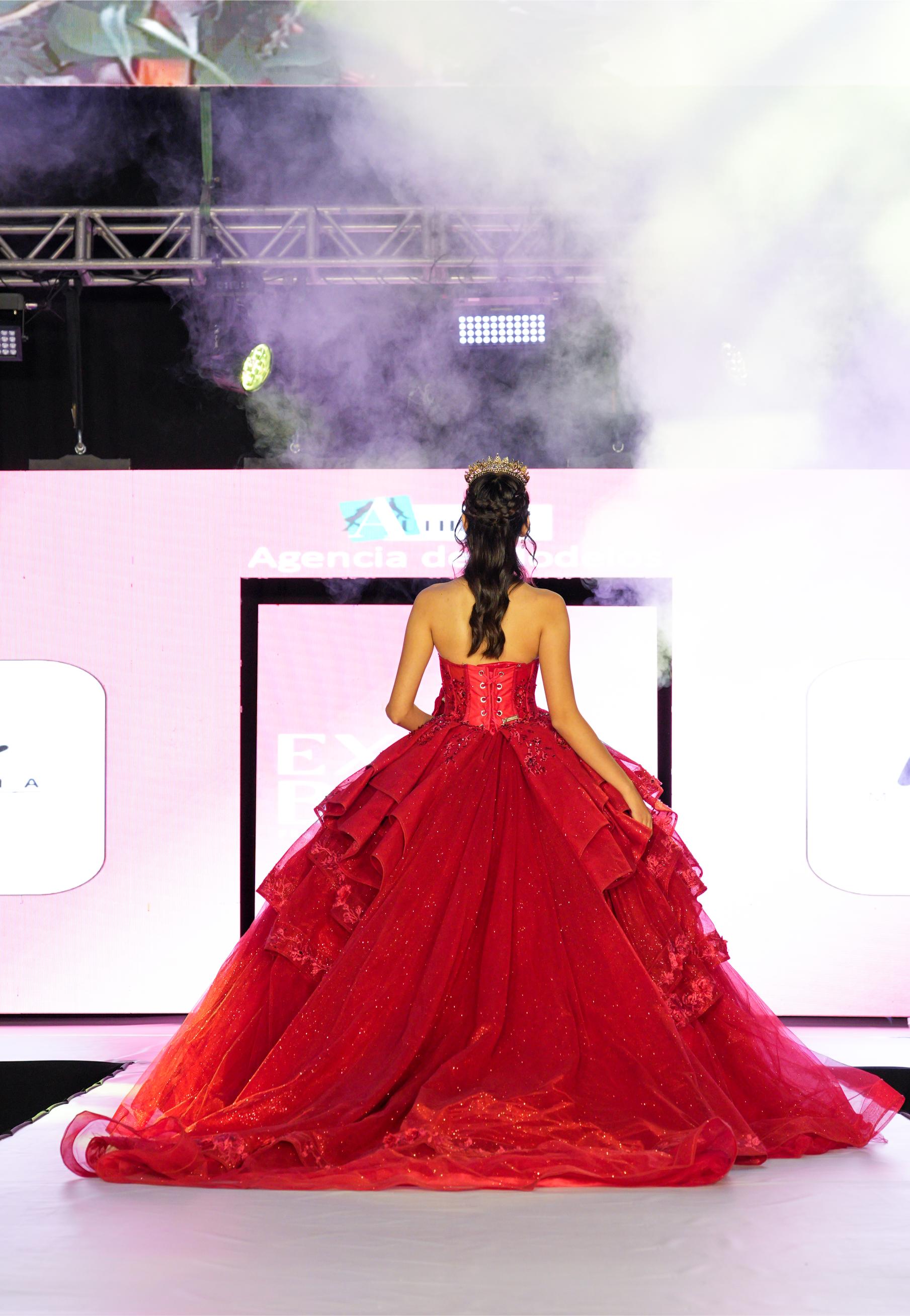 Vestido de XV Años Rojo Brilloso Estraple Olanes con Cauda