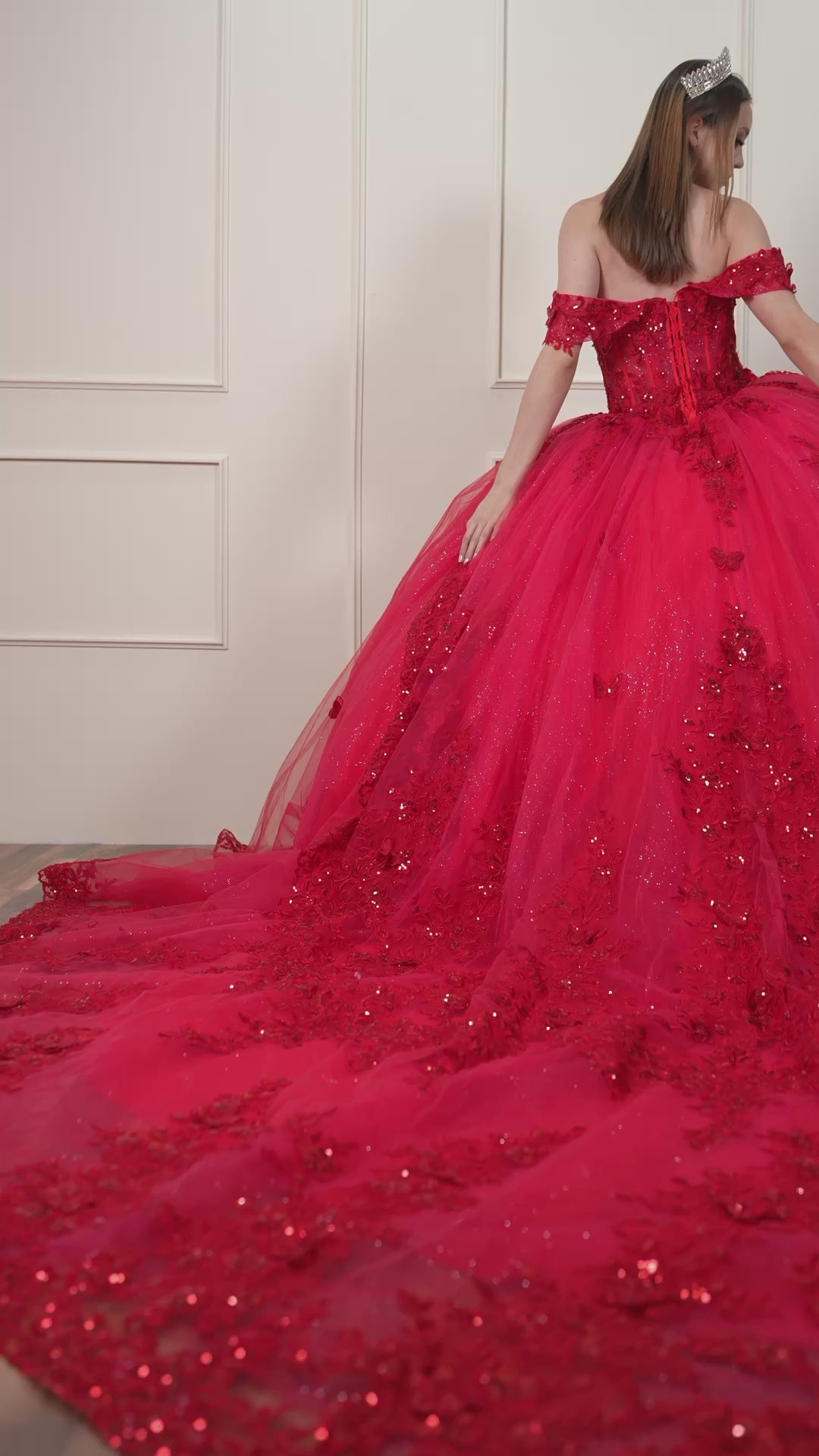 Vestido de XV Años Rojo Flores y Pedrería Manga Caída y Cauda (Renta)
